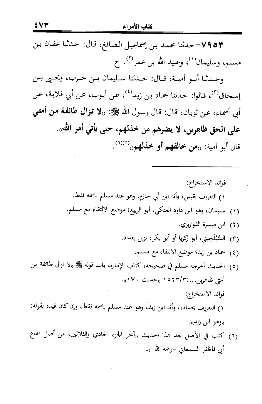 (¬5) الحديث أخرجه مسلم في صحيحه، كتاب الإمارة، باب قوله -صلى الله عليه وسلم- "لا تزال طائفة من أمتي ظاهرين ... : 3/ 1523 "حديث 170".