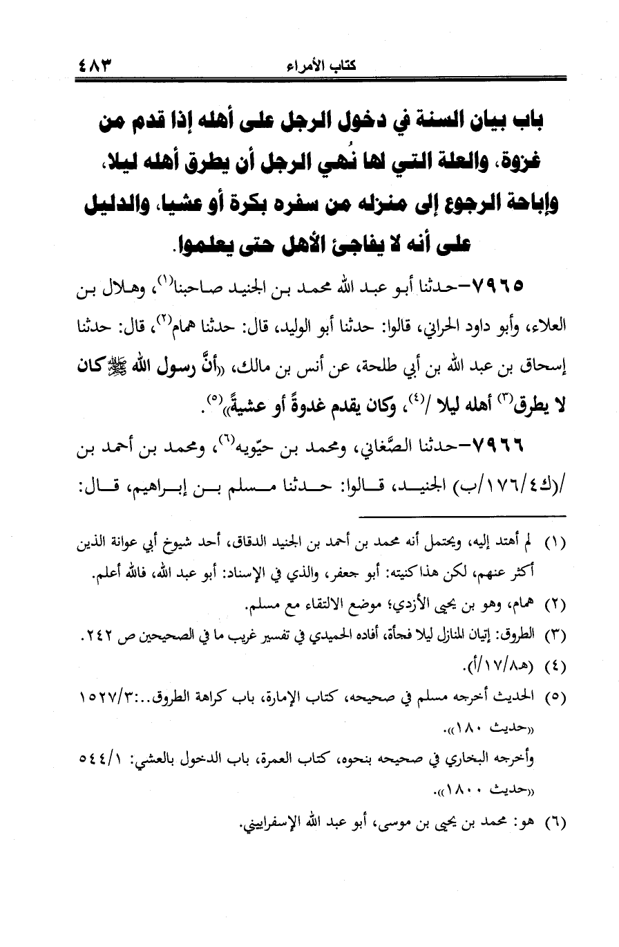 (¬5) الحديث أخرجه مسلم في صحيحه، كتاب الإمارة، باب كراهة الطروق .. : 3/ 1527 "حديث 180".
