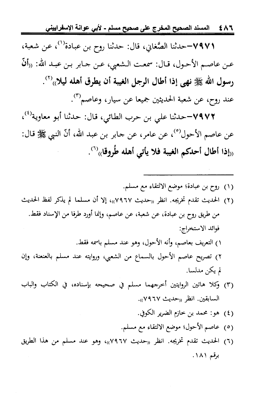 7971 - حدثنا الصَّغاني، قال: حدثنا روح بن عبادة (¬1)، عن شعبة، عن عاصم الأحول، قال: سمعت الشعبي، عن جابر بن عبد الله: "أنّ رسول الله -صلى الله عليه وسلم- نهى إذا أطال الرجل الغيبة أن يطرق أهله ليلا" (¬2).