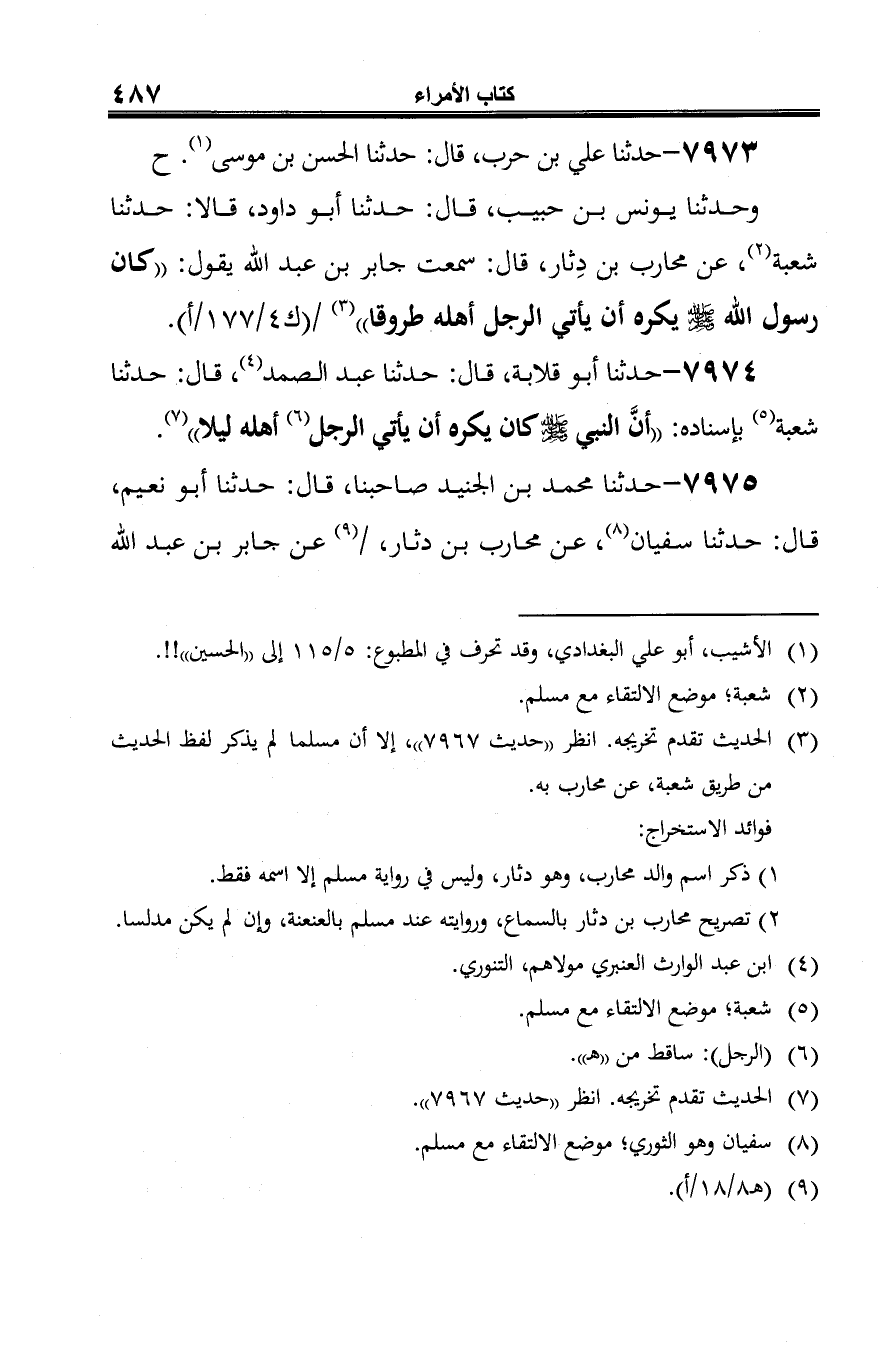 7974 - حدثنا أَبو قلابة، قال: حدثنا عبد الصمد (¬1)، قال: حدثنا شعبة (¬2) بإسناده: "أنَّ النبي -صلى الله عليه وسلم-كان يكره أن يأتي الرجل (¬3) أهله ليلا" (¬4).