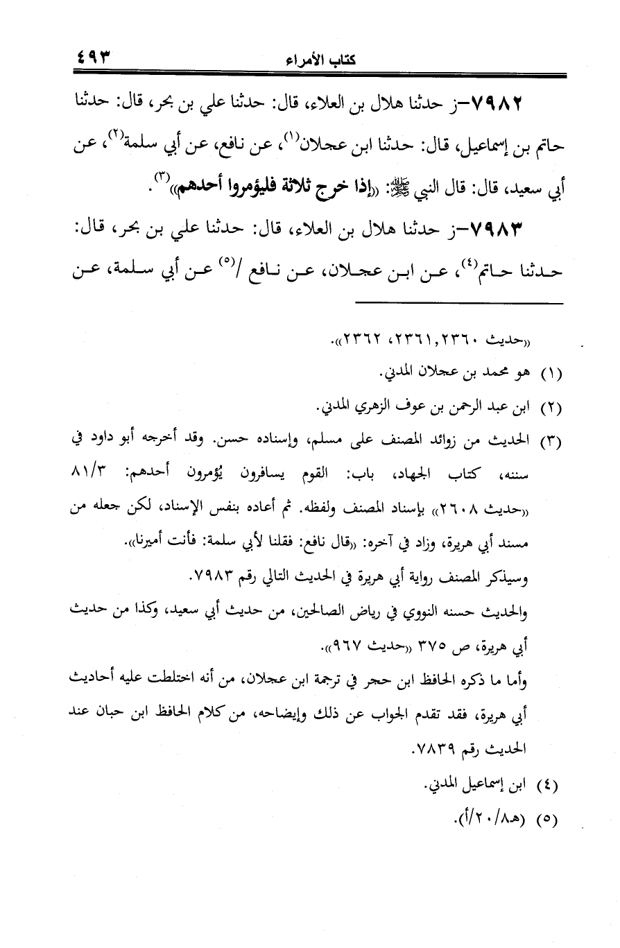 7982 - ز حدثنا هلال بن العلاء، قال: حدثنا علي بن بحر، قال: حدثنا حاتم بن إسماعيل، قال: حدثنا ابن عجلان (¬1)، عن نافع، عن أبي سلمة (¬2)، عن أبي سعيد، قال: قال النبي -صلى الله عليه وسلم-: "إذا خرج ثلاثة فليؤمروا أحدهم" (¬3).