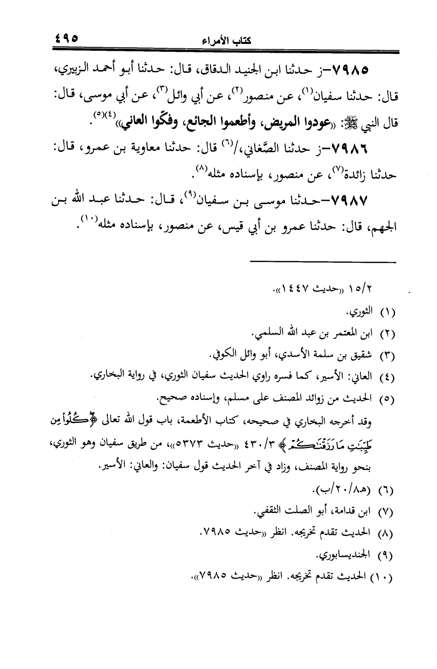 7985 - ز حدثنا ابن الجنيد الدقاق، قال: حدثنا أَبو أحمد الزبيري، قال: حدثنا سفيان (¬1)، عن منصور (¬2)، عن أبي وائل (¬3)، عن أبي موسى، قال: قال النبي -صلى الله عليه وسلم-: "عودوا المريض، وأطعموا الجائع، وفكّوا العاني" (¬4) (¬5).