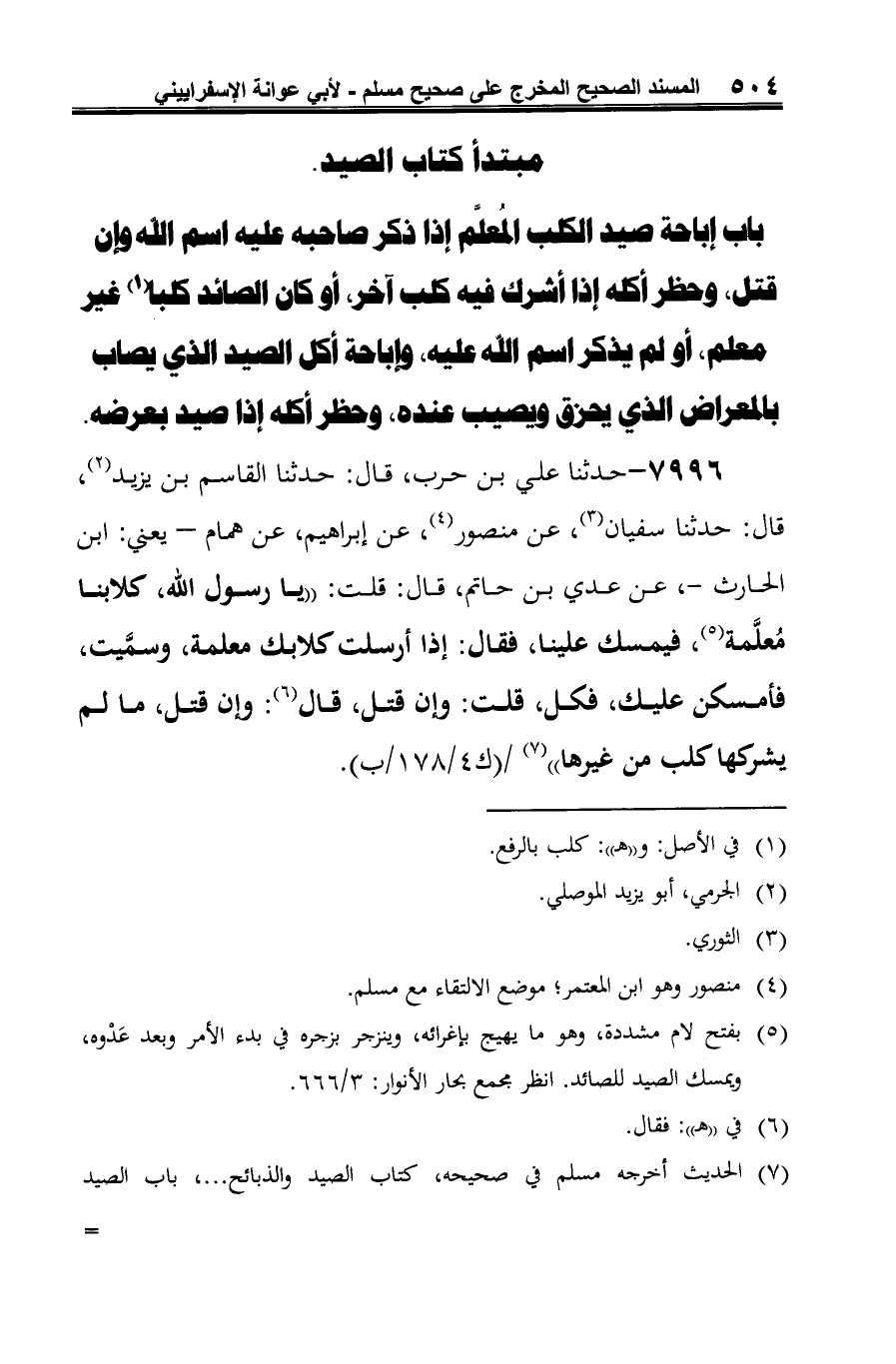 7996 - حدثنا علي بن حرب، قال: حدثنا القاسم بن يزيد (¬1)، قال: حدثنا سفيان (¬2)، عن منصور (¬3)، عن إبراهيم، عن همام -يعني: ابن الحارث-، عن عدي بن حاتم، قال: قلت: "يا رسول الله، كلابنا مُعلَّمة (¬4)، فيمسك علينا، فقال: إذا أرسلت كلابك معلمة، وسمَّيت، فأمسكن عليك، فكل، قلت: وإن قتل، قال (¬5): وإن قتل، ما لم يشركها كلب من غيرها" (¬6).
