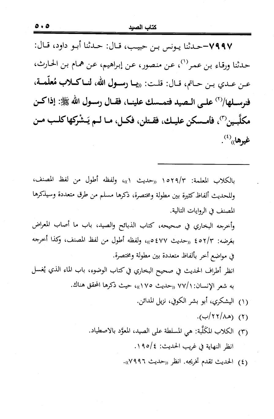 7997 - حدثنا يونس بن حبيب، قال: حدثنا أبو داود، قال: حدثنا ورقاء بن عمر (¬1)، عن منصور، عن إبراهيم، عن همام بن الحارث، عن عدي بن حاتم، قال: قلت: "يا رسول الله، لنا كلاب مُعلّمة، فنرسلها (¬2) على الصيد فتمسك علينا، فقال رسول الله -صلى الله عليه وسلم-: إذا كن مكلَّبين (¬3)، فأمسكن عليك، فقتلن، فكل، ما لم يَشْركها كلب من غيرها" (¬4).