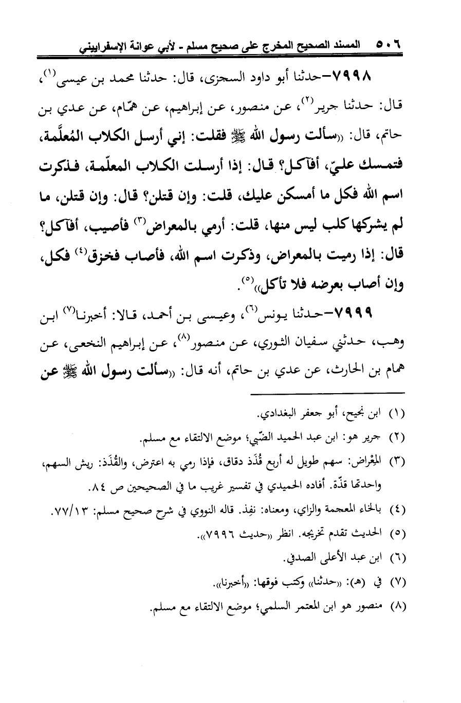 7998 - حدثنا أبو داود السجزى، قال: حدثنا محمد بن عيسى (¬1)، قال: حدثنا جرير (¬2)، عن منصور، عن إبراهيم، عن همّام، عن عدي بن حاتم، قال: "سألت رسول الله -صلى الله عليه وسلم- فقلت: إني أرسل الكلاب المُعلَّمة، فتمسك عليّ، أفآكل؟ قال: إذا أرسلت الكلاب المعلّمة، فذكرت اسم الله فكل ما أمسكن عليك، قلت: وإن قتلن؟ قال: وإن قتلن، ما لم يشركها كلب ليس منها، قلت: أرمي بالمعراض (¬3) فأصيب، أفآكل؟ قال: إذا رميت بالمعراض، وذكرت اسم الله، فأصاب فخزق (¬4) فكل، وإن أصاب بعرضه فلا تأكل" (¬5).