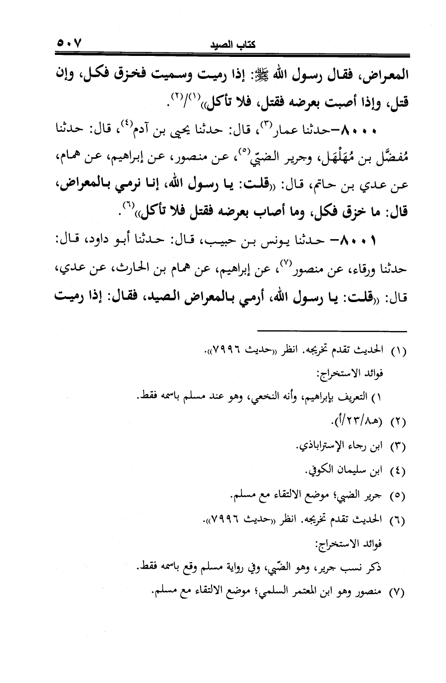 8000 - حدثنا عمار (¬1)، قال: حدثنا يحيى بن آدم (¬2)، قال: حدثنا مُفضَّل بن مُهَلْهَل، وجرير الضبي (¬3)، عن منصور، عن إبراهيم، عن همام، عن عدي بن حاتم، قال: "قلت: يا رسول الله، إنا نرمي بالمعراض، قال: ما خزق فكل، وما أصاب بعرضه فقتل فلا تأكل" (¬4).