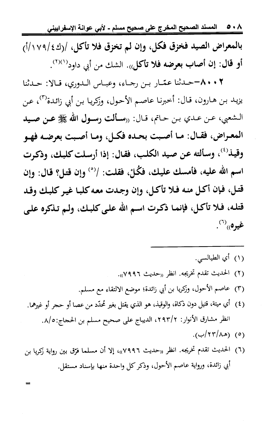 8002 - حدثنا عمّار بن رجاء، وعباس الدوري، قالا: حدثنا يزيد بن هارون، قال: أخبرنا عاصم الأحول، وزكريا بن أبي زائدة (¬1)، عن الشعبي، عن عدي بن حاتم، قال: "سألت رسول الله -صلى الله عليه وسلم- عن صيد المعراض، فقال: ما أصبت بحده فكل، وما أصبت بعرضه فهو وقيذ (¬2)، وسألته عن صيد الكلب، فقال: إذا أرسلت كلبك، وذكرت اسم الله عليه، فأمسك عليك، فكُلْ، فقلت: (¬3) وإن قتل؟ قال: وإن قتل، فإن أكل منه فلا تأكل، وإن وجدت معه كلبا غير كلبك وقد قتله، فلا تأكل، فإنما ذكرت اسم الله على كلبك، ولم تذكره على غيره" (¬4).