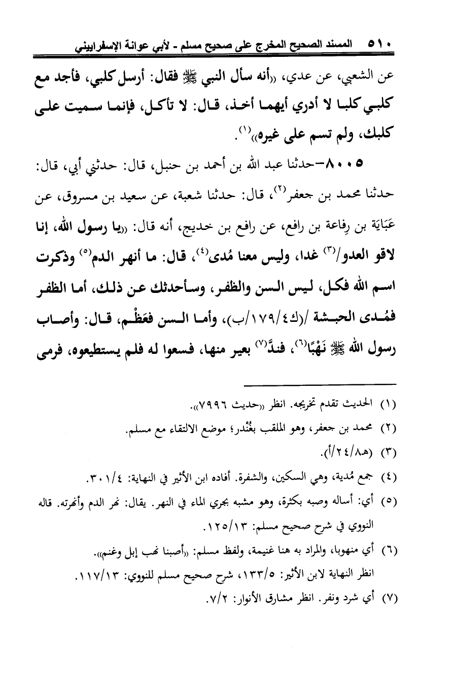 (¬12) الحديث أخرجه مسلم في صحيحه بنحوه، كتاب الأضاحي، باب جواز الذبح بكل ما أنهر الدم، إلا السن والظُّفر وسائر العظام: 3/ 1559 "حديث 23"، إلا أن مسلما لم يذكره من طريق شعبة، عن سعيد بن مسروق إلا طرفا من الحديث.