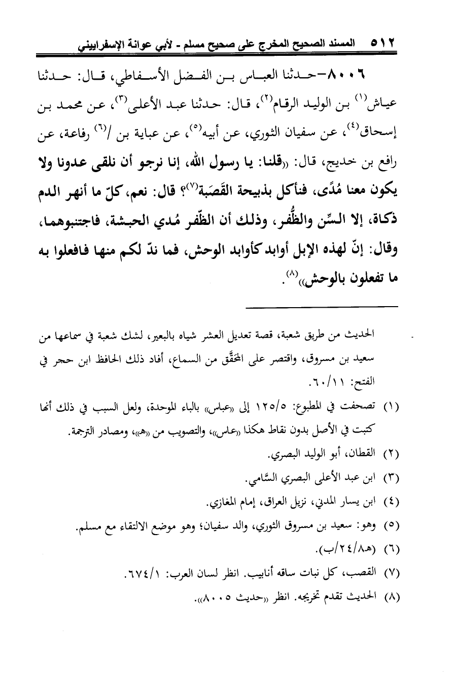 8006 - حدثنا العباس بن الفضل الأسفاطي، قال: حدثنا عياش (¬1) بن الوليد الرقام (¬2)، قال: حدثنا عبد الأعلى (¬3)، عن محمد بن إسحاق (¬4)، عن سفيان الثوري، عن أبيه (¬5)، عن عباية بن (¬6) رفاعة، عن رافع بن خديج، قال: "قلنا: يا رسول الله، إنا نرجو أن نلقى عدونا ولا يكون معنا مُدًى، فنأكل بذبيحة القَصَبة (¬7)؟ قال: نعم، كلّ ما أنهر الدم ذكاة، إلا السِّن والظُّفر، وذلك أن الظّفر مُدي الحبشة، فاجتنبوهما، وقال: إنّ لهذه الإبل أوابد كأوابد الوحش، فما ندّ لكم منها فافعلوا به ما تفعلون بالوحش" (¬8).