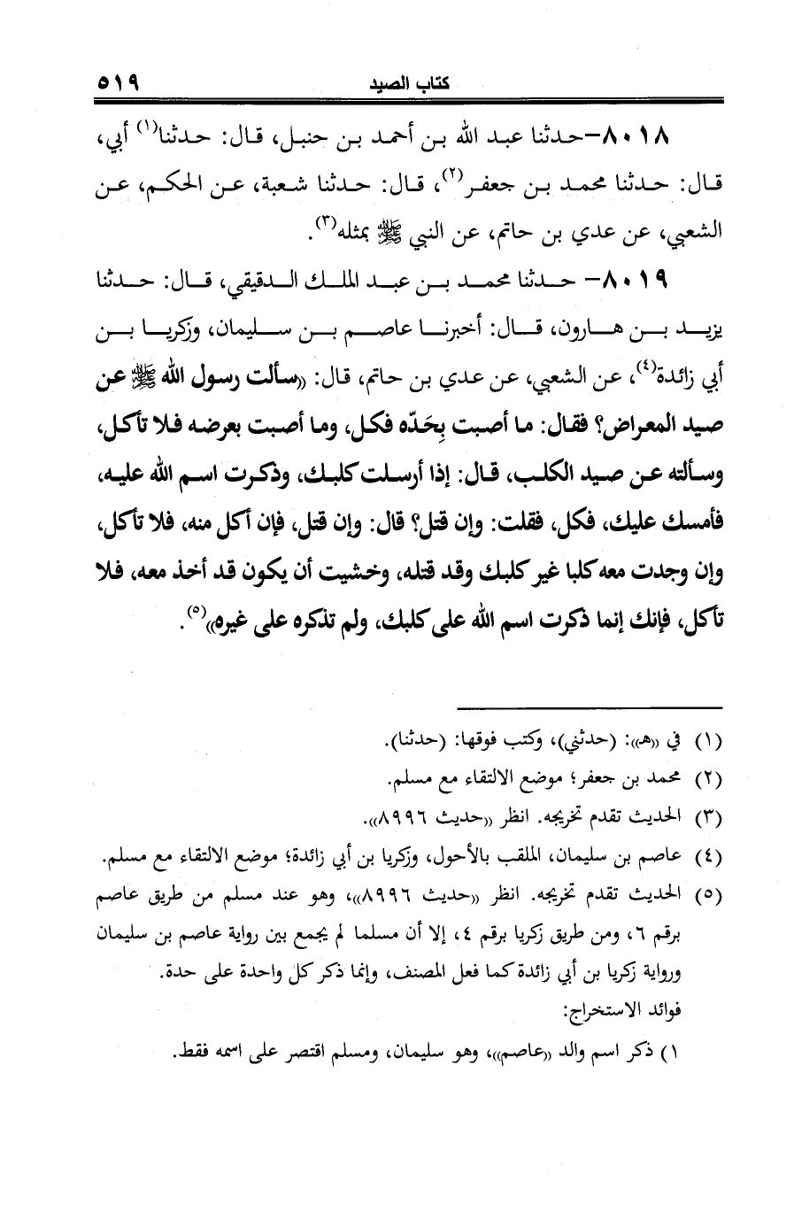 8018 - حدثنا عبد الله بن أحمد بن حنبل، قال: حدثنا (¬1) أبي، قال: حدثنا محمد بن جعفر (¬2)، قال: حدثنا شعبة، عن الحكم، عن الشعبي، عن عدي بن حاتم، عن النبي -صلى الله عليه وسلم- بمثله (¬3).