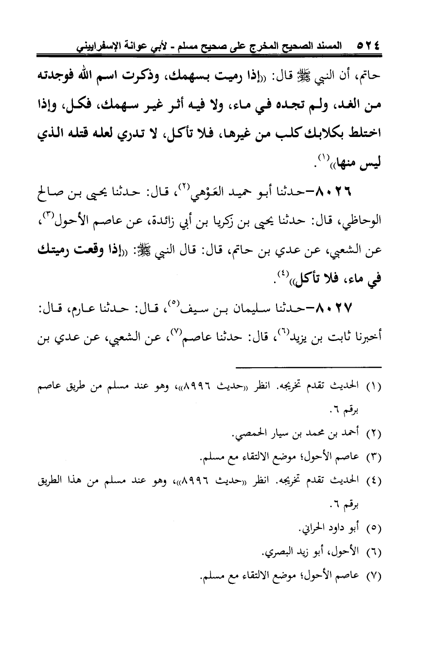 8026 - حدثنا أبو حميد العَوْهي (¬1)، قال: حدثنا يحيى بن صالح الوحاظي، قال: حدثنا يحيى بن زكريا بن أبي زائدة، عن عاصم الأحول (¬2)، عن الشعبي، عن عدي بن حاتم، قال: قال النبي -صلى الله عليه وسلم-: "إذا وقعت رميتك في ماء، فلا تأكل" (¬3).