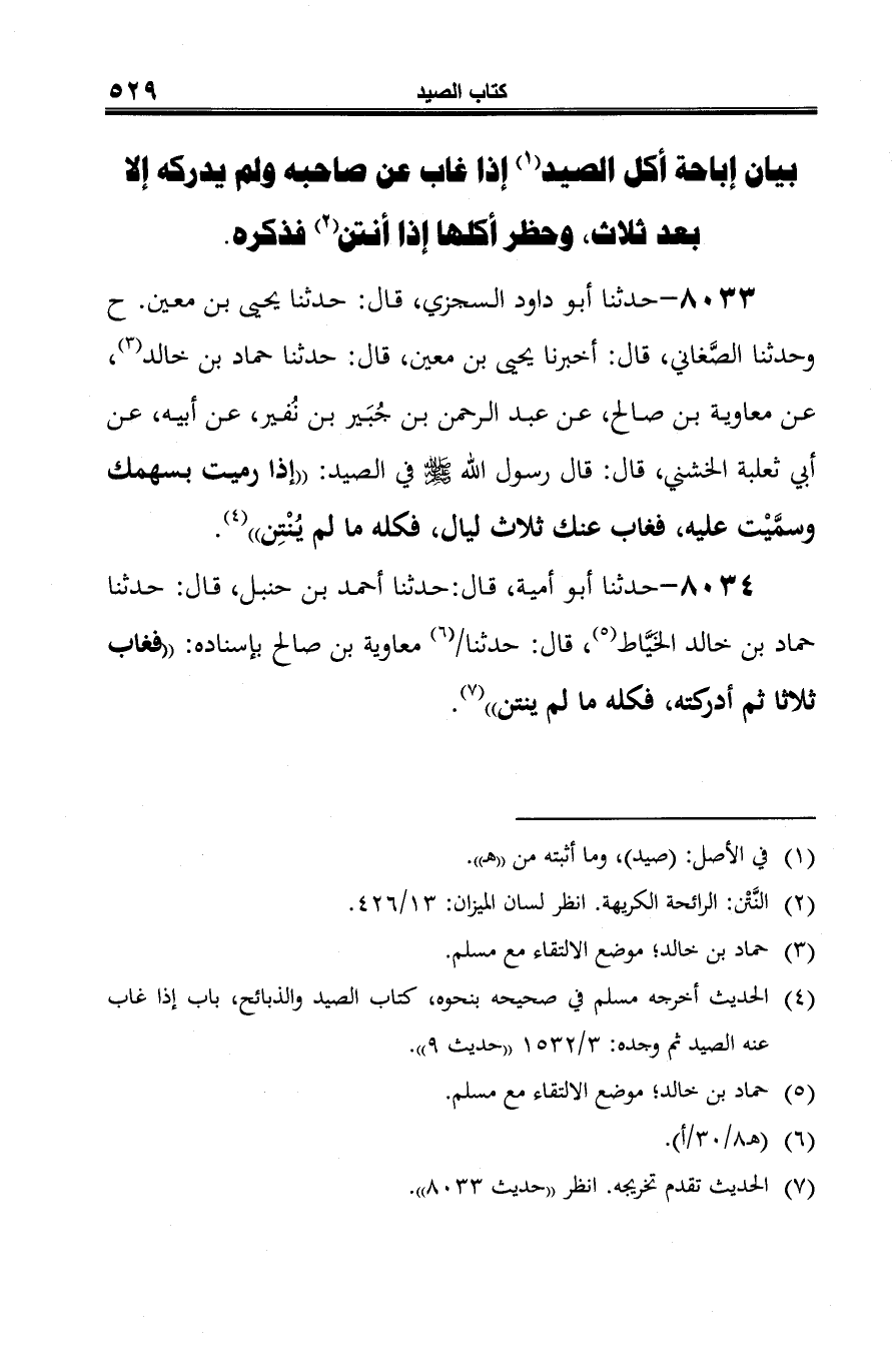 وحدثنا الصَّغاني، قال: أخبرنا يحيى بن معين، قال: حدثنا حماد بن خالد (¬1)، عن معاوية بن صالح، عن عبد الرحمن بن جُبَير بن نُفير، عن أبيه، عن أبي ثعلبة الخشني، قال: قال رسول الله -صلى الله عليه وسلم- في الصيد: "إذا رميت بسهمك وسمَّيْت عليه، فغاب عنك ثلاث ليال، فكله ما لم ينْتِن" (¬2).