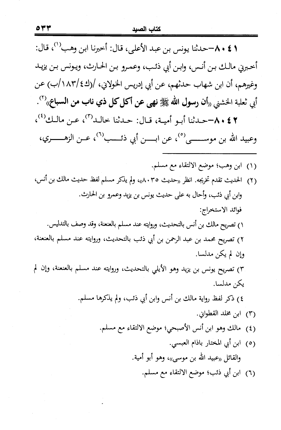 8041 - حدثنا يونس بن عبد الأعلى، قال: أخبرنا ابن وهب (¬1)، قال: أخبرني مالك بن أنس، وابن أبي ذئب، وعمرو بن الحارث، ويونس بن يزيد وغيرهم، أن ابن شهاب حدثهم، عن أبي إدريس الخولاني، عن أبي ثعلبة الخشني "أن رسول الله -صلى الله عليه وسلم- نهى عن أكل كل ذي ناب من السباع" (¬2).