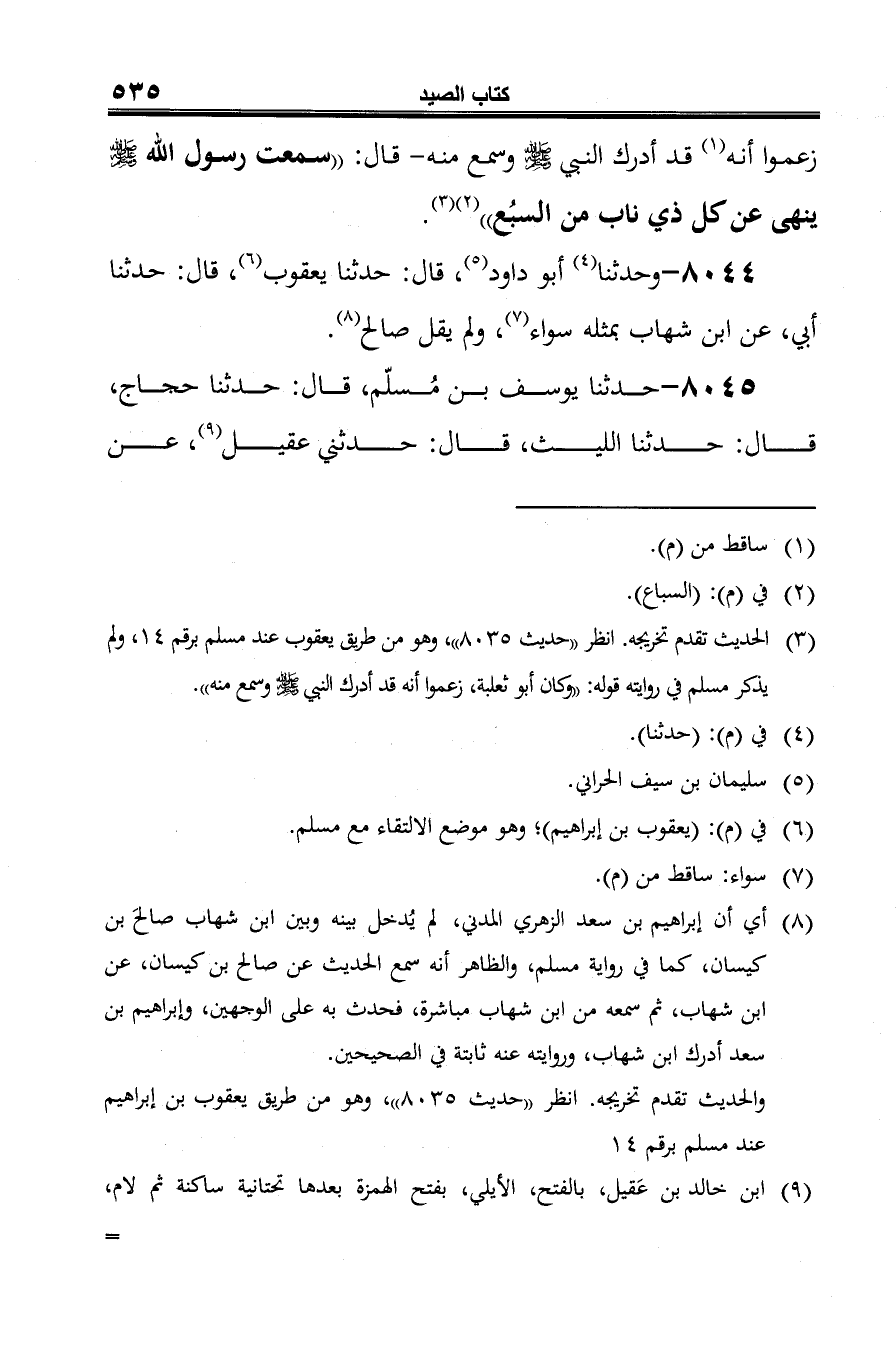 8044 - وحدثنا (¬1) أبو داود (¬2)، قال: حدثنا يعقوب (¬3)، قال: حدثنا أبي، عن ابن شهاب بمثله سواء (¬4)، ولم يقل صالح (¬5).