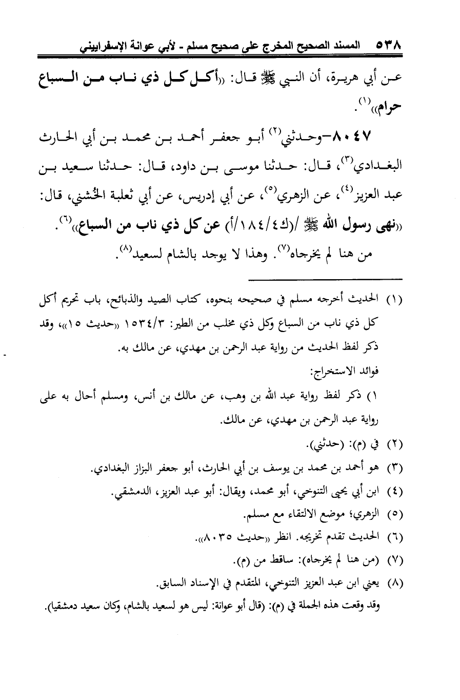 8047 - وحدثني (¬1) أبو جعفر أحمد بن محمد بن أبي الحارث البغدادي (¬2)، قال: حدثنا موسى بن داود، قال: حدثنا سعيد بن عبد العزيز (¬3)، عن الزهري (¬4)، عن أبي إدريس، عن أبي ثعلبة الخُشني، قال: "نهى رسول الله -صلى الله عليه وسلم- عن كل ذي ناب من السباع" (¬5).