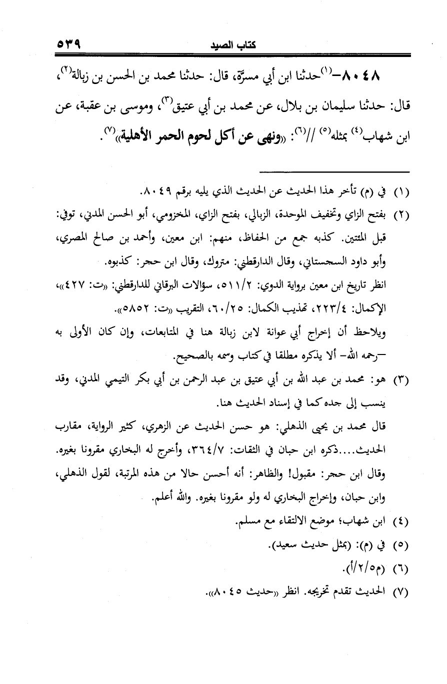 8048 - (¬1) حدثنا ابن أبي مسرَّة، قال: حدثنا محمد بن الحسن بن زبالة (¬2)، قال: حدثنا سليمان بن بلال، عن محمد بن أبي عتيق (¬3)، وموسى بن عقبة، عن ابن شهاب (¬4) بمثله (¬5) (¬6): "ونهى عن أكل لحوم الحمر الأهلية" (¬7).