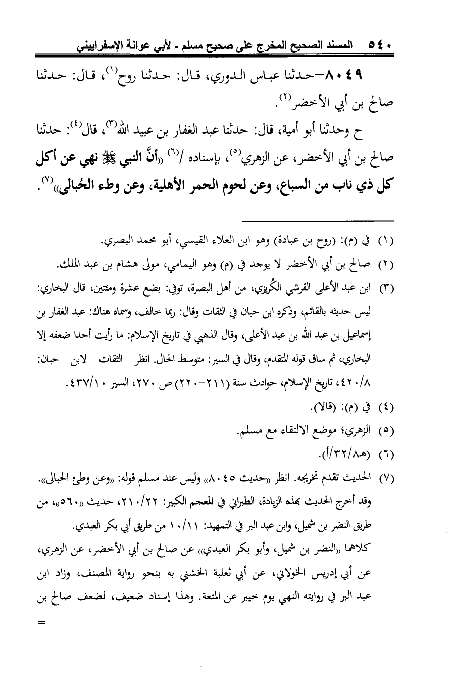 ح وحدثنا أبو أمية، قال: حدثنا عبد الغفار بن عبيد الله (¬3)، قال (¬4): حدثنا صالح بن أبي الأخضر، عن الزهري (¬5)، بإسناده (¬6) "أنَّ النبي -صلى الله عليه وسلم- نهى عن أكل كل ذي ناب من السباع، وعن لحوم الحمر الأهلية، وعن وطء الحُبالى" (¬7).