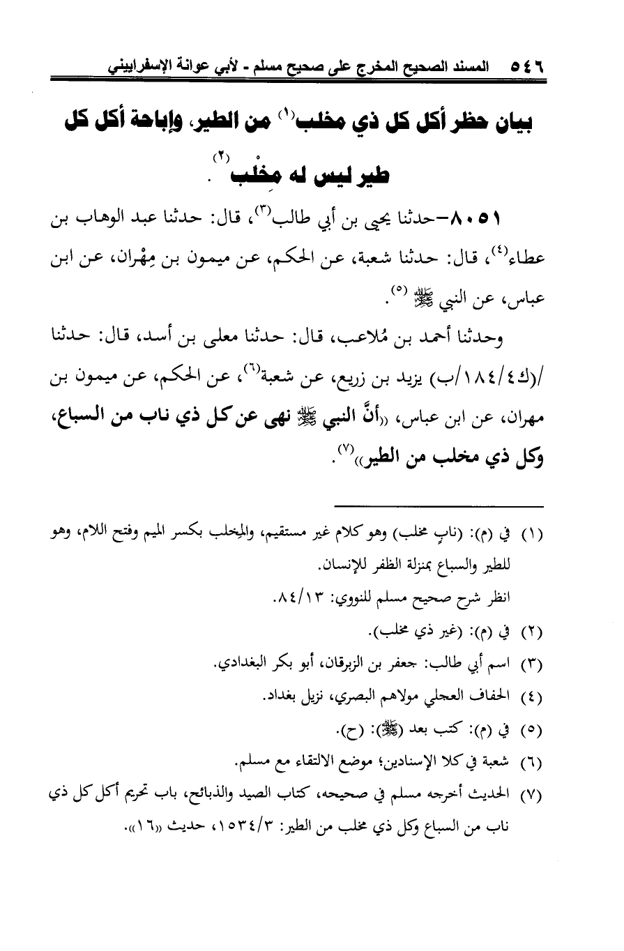 8051 - حدثنا يحيى بن أبي طالب (¬1)، قال: حدثنا عبد الوهاب بن عطاء (¬2)، قال: حدثنا شعبة، عن الحكم، عن ميمون بن مِهْران، عن ابن عباس، عن النبي -صلى الله عليه وسلم- (¬3).