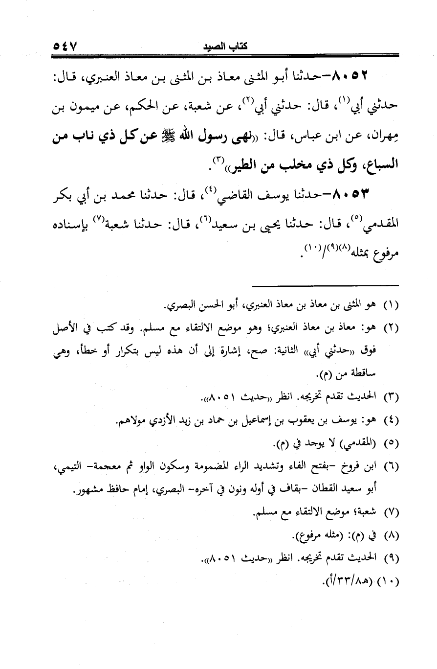 8052 - حدثنا أبو المثنى معاذ بن المثنى بن معاذ العنبري، قال: حدثني أبي (¬1)، قال: حدثني أبي (¬2)، عن شعبة، عن الحكم، عن ميمون بن مِهران، عن ابن عباس، قال: "نهى رسول الله -صلى الله عليه وسلم- عن كل ذي ناب من السباع، وكل ذي مخلب من الطير" (¬3).