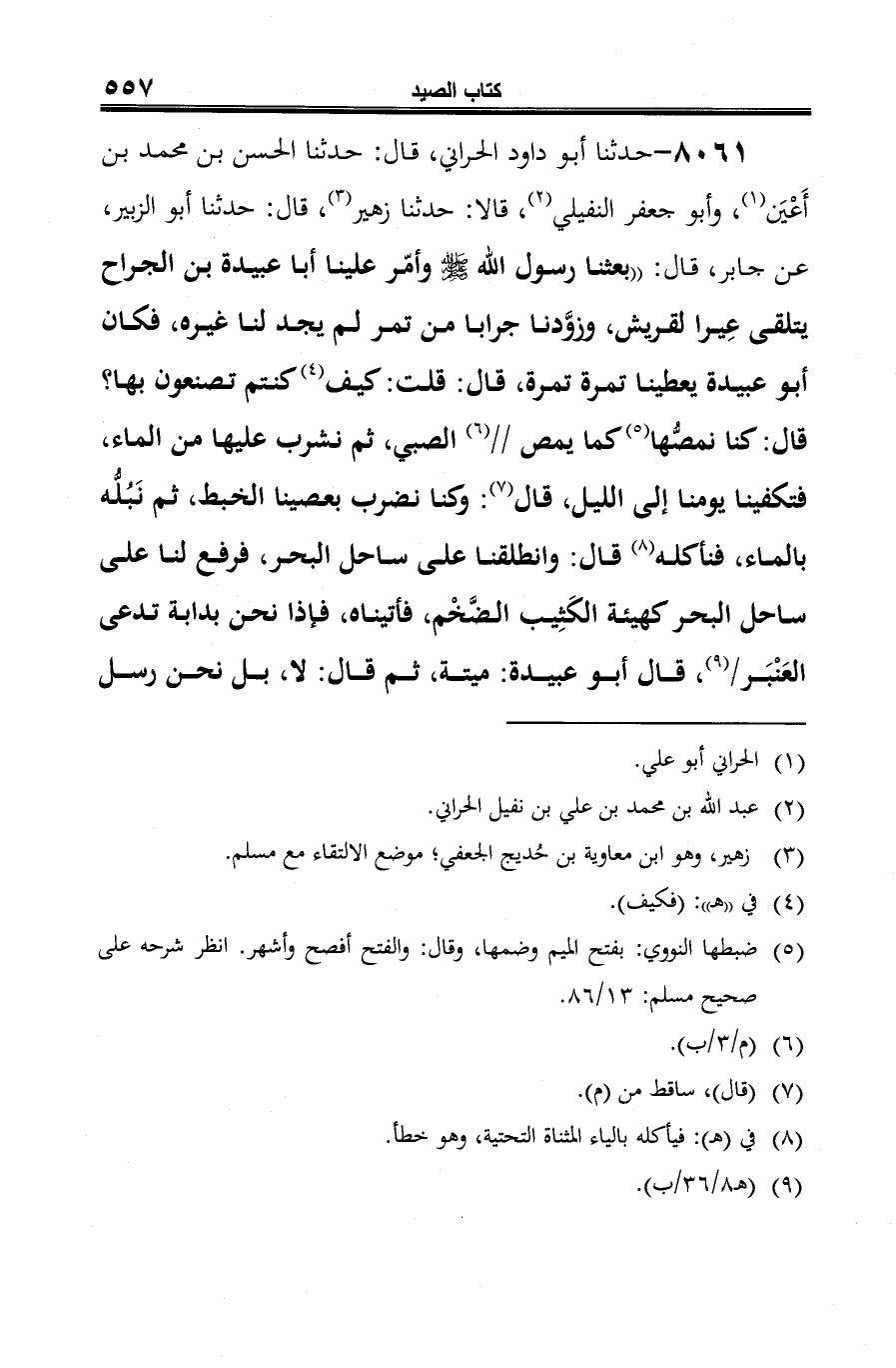 8061 - حدثنا أبو داود الحراني، قال: حدثنا الحسن بن محمد بن أَعْيَن (¬1)، وأبو جعفر النفيلي (¬2)، قالا: حدثنا زهير (¬3)، قال: حدثنا أبو الزبير، عن جابر، قال: "بعثنا رسول الله صلى الله عليه وسلم وأمّر علينا أبا عبيدة بن الجراح يتلقى عِيرا لقريش، وزوَّدنا جرابا من تمر لم يجد لنا غيره، فكان أبو عبيدة يعطينا تمرة تمرة، قال: قلت: كيف (¬4) كنتم تصنعون بها؟ قال: كنا نمصُّها (¬5) كما يمص (¬6) الصبي، ثم نشرب عليها من الماء، فتكفينا يومنا إلى الليل، قال (¬7): وكنا نضرب بعصينا الخبط، ثم نَبُلُّه بالماء، فنأكله (¬8) قال: وانطلقنا على ساحل البحر، فرفع لنا على ساحل البحر كهيئة الكَثِيب الضَّخْم، فأتيناه، فإذا نحن بدابة تدعى العَنْبَر (¬9)، قال أبو عبيدة: ميتة، ثم قال: لا، بل نحن رسل