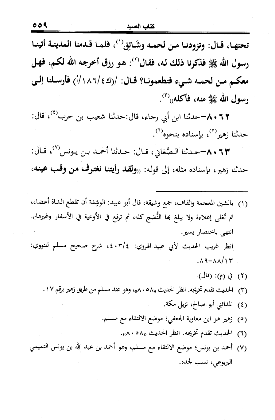 8063 - حدثنا الصَّغاني، قال: حدثنا أحمد بن يونس (¬1)، قال: حدثنا زهير، بإسناده مثله، إلى قوله: "ولقد رأيتنا نغترف من وقب عينه،