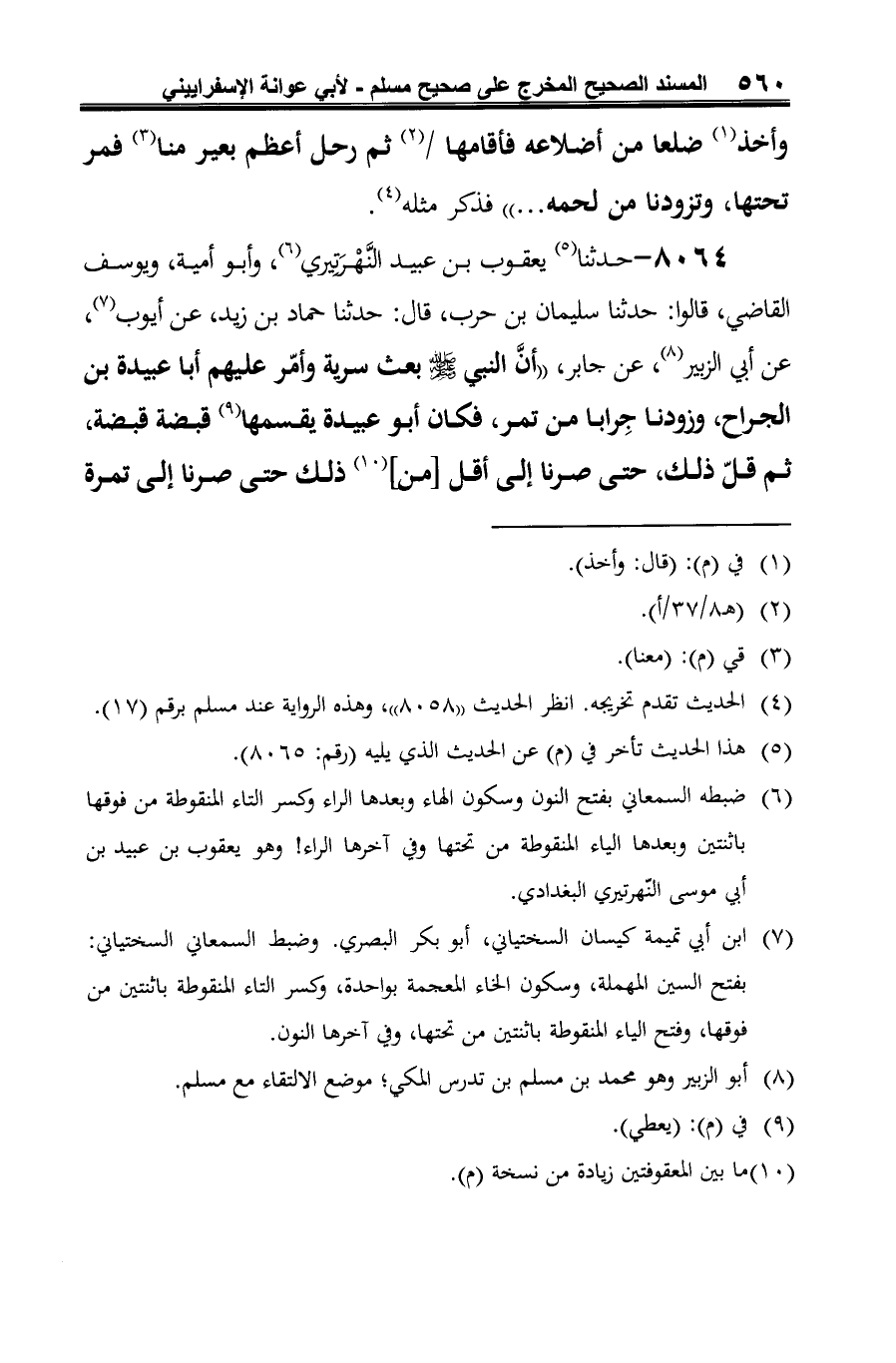 8064 - حدثنا (¬1) يعقوب بن عبيد النَّهْرَتِيري (¬2)، وأبو أمية، ويوسف القاضي، قالوا: حدثنا سليمان بن حرب، قال: حدثنا حماد بن زيد، عن أيوب (¬3)، عن أبي الزبير (¬4)، عن جابر، "أنَّ النبي صلى الله عليه وسلم بعث سرية وأمّر عليهم أبا عبيدة بن الجراح، وزودنا جِرابا من تمر، فكان أبو عبيدة يقسمها (¬5) قبضة قبضة، ثم قلّ ذلك، حتى صرنا إلى أقل [من] (¬6) ذلك حتى صرنا إلى تمرة