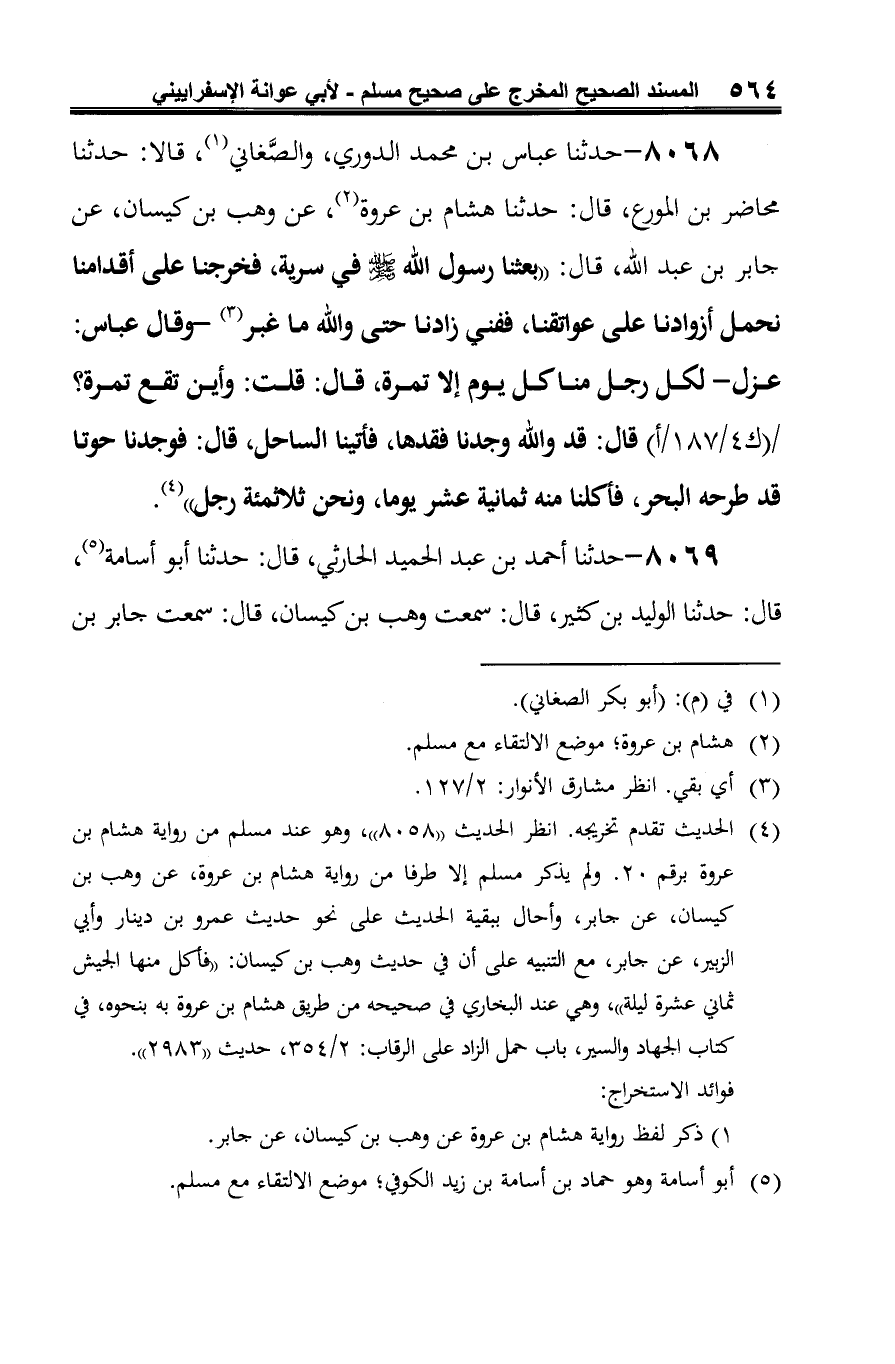 (¬4) الحديث تقدم تخريجه. انظر الحديث "8058"، وهو عند مسلم من رواية هشام بن عروة برقم 20. ولم يذكر مسلم إلا طرفا من رواية هشام بن عروة، عن وهب بن كيسان، عن جابر، وأحال ببقية الحديث على نحو حديث عمرو بن دينار وأبي الزبير، عن جابر، مع التنبيه على أن في حديث وهب بن كيسان: "فأكل منها الجيش ثماني عشرة ليلة"، وهي عند البخاري في صحيحه من طريق هشام بن عروة به بنحوه، في كتاب الجهاد والسير، باب حمل الزاد على الرقاب: 2/ 354، حديث "2983".