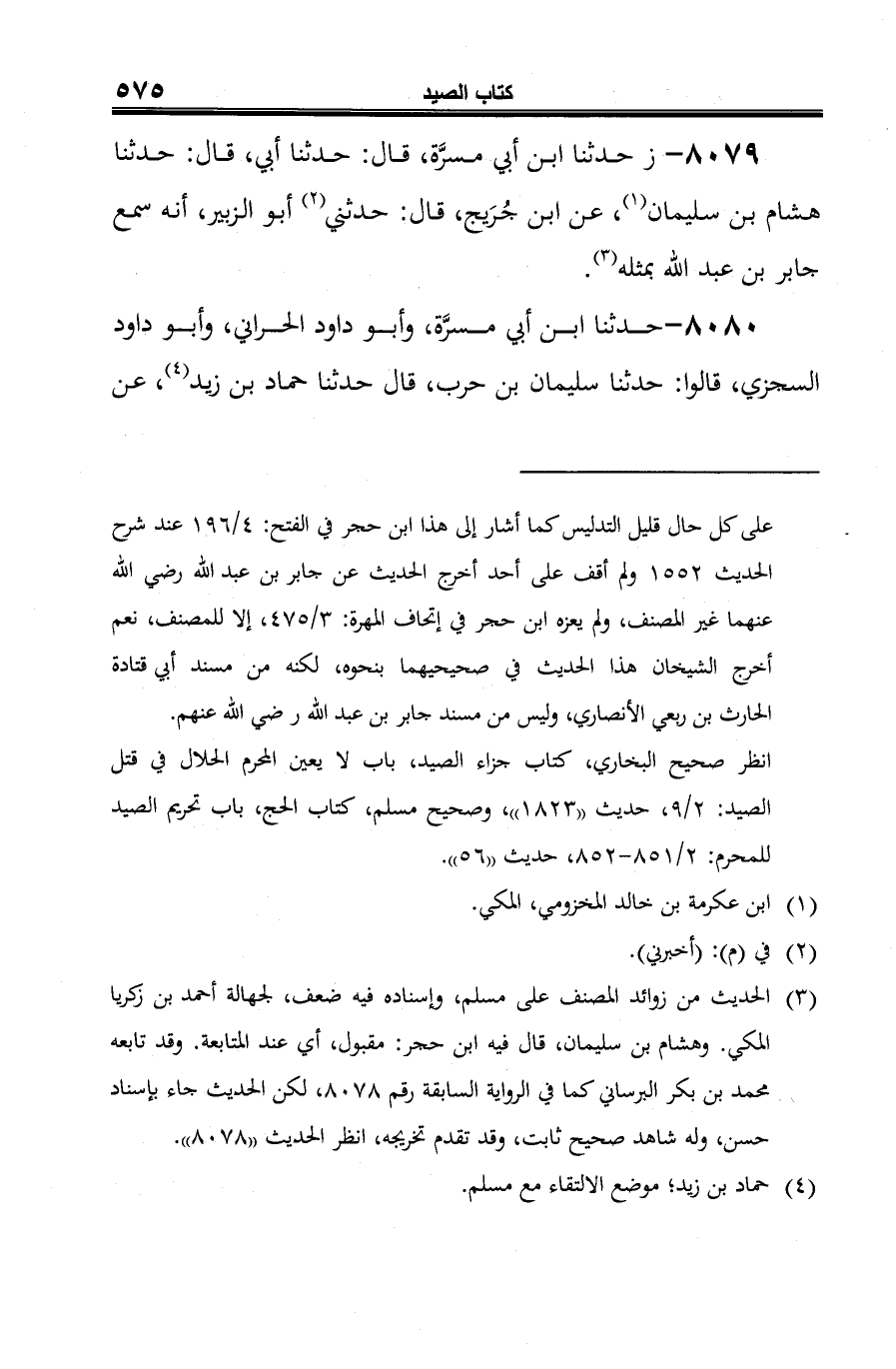 8079 - ز حدثنا ابن أبي مسرَّة، قال: حدثنا أبي، قال: حدثنا هشام بن سليمان (¬1)، عن ابن جُرَيج، قال: حدثني (¬2) أبو الزبير، أنه سمع جابر بن عبد الله بمثله (¬3).