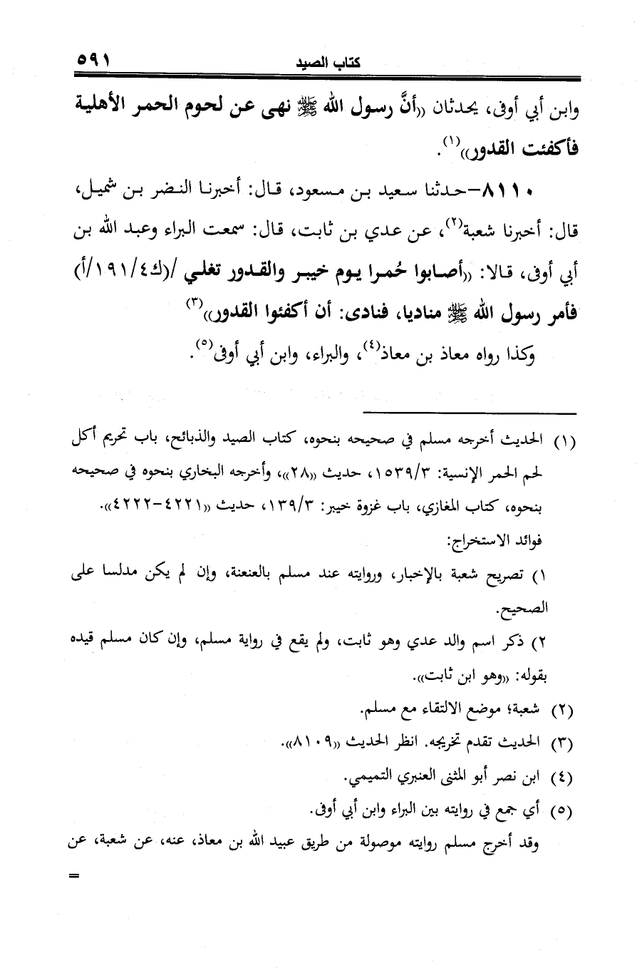 8110 - حدثنا سعيد بن مسعود، قال: أخبرنا النضر بن شميل، قال: أخبرنا شعبة (¬1)، عن عدي بن ثابت، قال: سمعت البراء وعبد الله بن أبي أوفى، قالا: "أصابوا حُمرا يوم خيبر والقدور تغلي فأمر رسول الله صلى الله عليه وسلم مناديا، فنادى: أن أكفئوا القدور" (¬2).