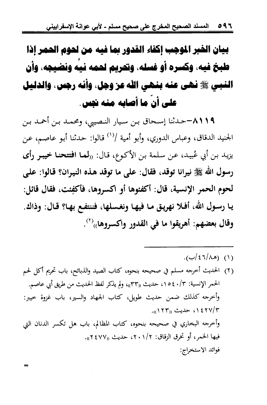 8119 - حدثنا إسحاق بن سيار النصيبي، ومحمد بن أحمد بن الجنيد الدقاق، وعباس الدوري، وأبو أمية (¬1) قالوا: حدثنا أبو عاصم، عن يزيد بن أبي عُبيد، عن سلمة بن الأكوع، قال: "لما افتتحنا خيبر رأى رسول الله صلى الله عليه وسلم نيرانا توقد، فقال: على ما توقد هذه النيران؟ قالوا: على لحوم الحمر الإنسية، قال: أكفئوها أو اكسروها، فأكفِئت، فقال قائل: يا رسول الله، أفلا نهريق ما فيها ونغسلها، فننتفع بها؟ قال: وذاك.