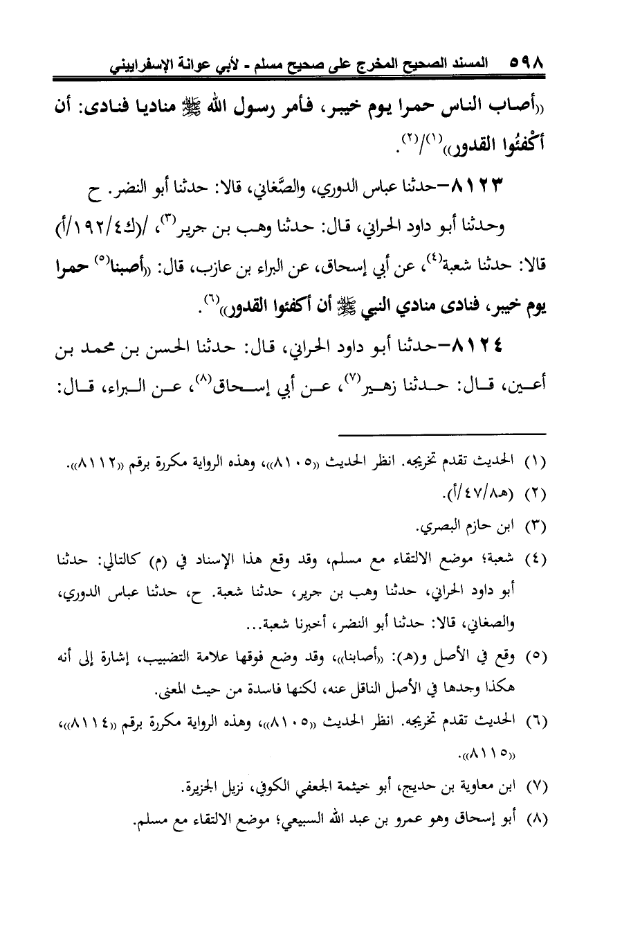 وحدثنا أبو داود الحراني، قال: حدثنا وهب بن جرير (¬1)، قالا: حدثنا شعبة (¬2)، عن أبي إسحاق، عن البراء بن عازب، قال: "أصبنا (¬3) حمرا يوم خيبر، فنادى منادي النبي صلى الله عليه وسلم أن أكفئوا القدور" (¬4).