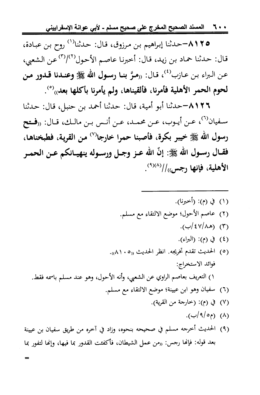 8125 - حدثنا إبراهيم بن مرزوق، قال: حدثنا (¬1) روح بن عبادة، قال: حدثنا حماد بن زيد، قال: أخبرنا عاصم الأحول (¬2) (¬3) عن الشعبي، عن البراء بن عازب (¬4)، قال: "مرَّ بنا رسول الله -صلى الله عليه وسلم- وعندنا قدور من لحوم الحمر الأهلية فأمرنا، فألقيناها، ولم يأمرنا بأكلها بعد" (¬5).