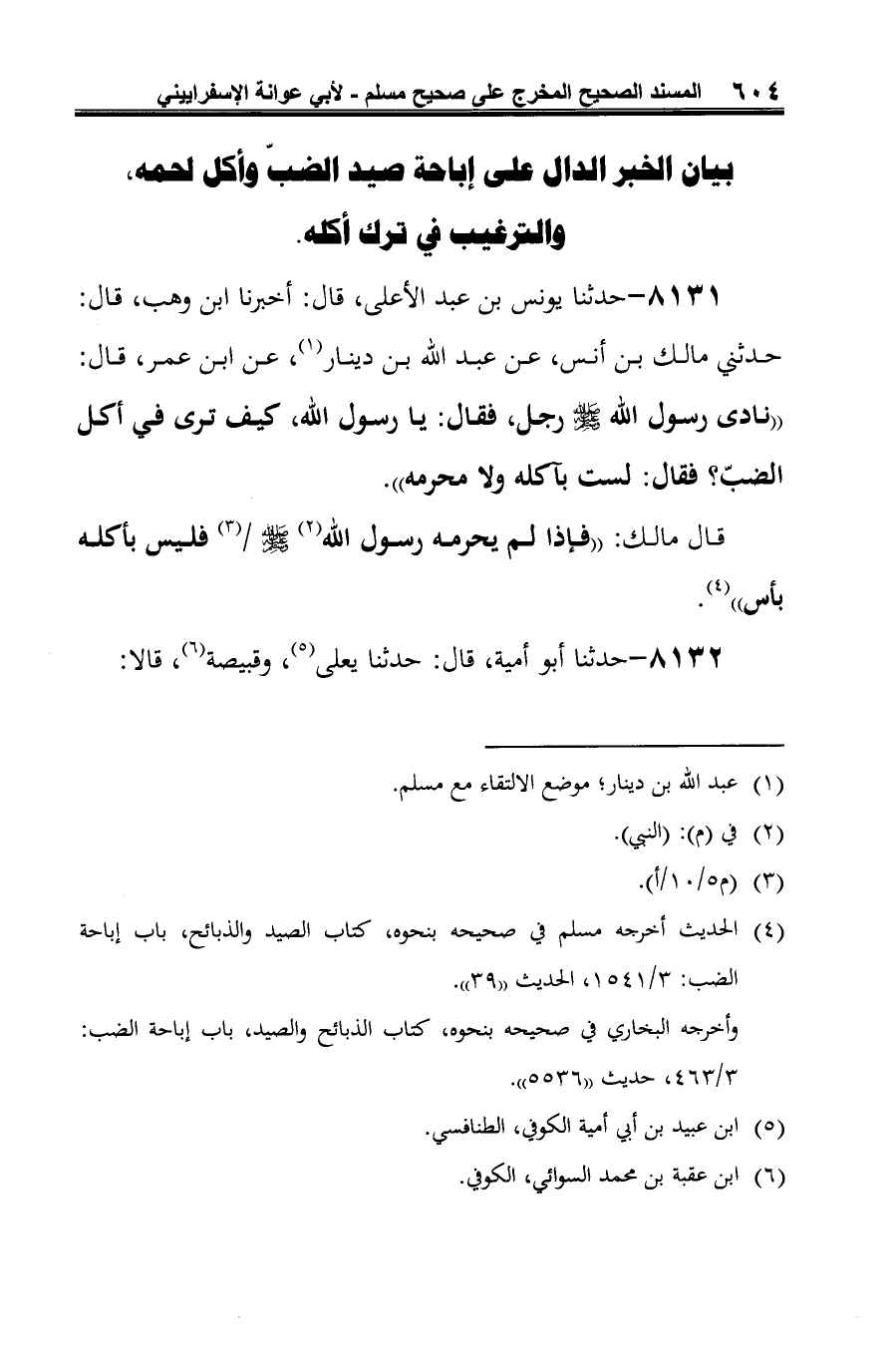 (¬4) الحديث أخرجه مسلم في صحيحه بنحوه، كتاب الصيد والذبائح، باب إباحة الضب: 3/ 1541، الحديث "39".
