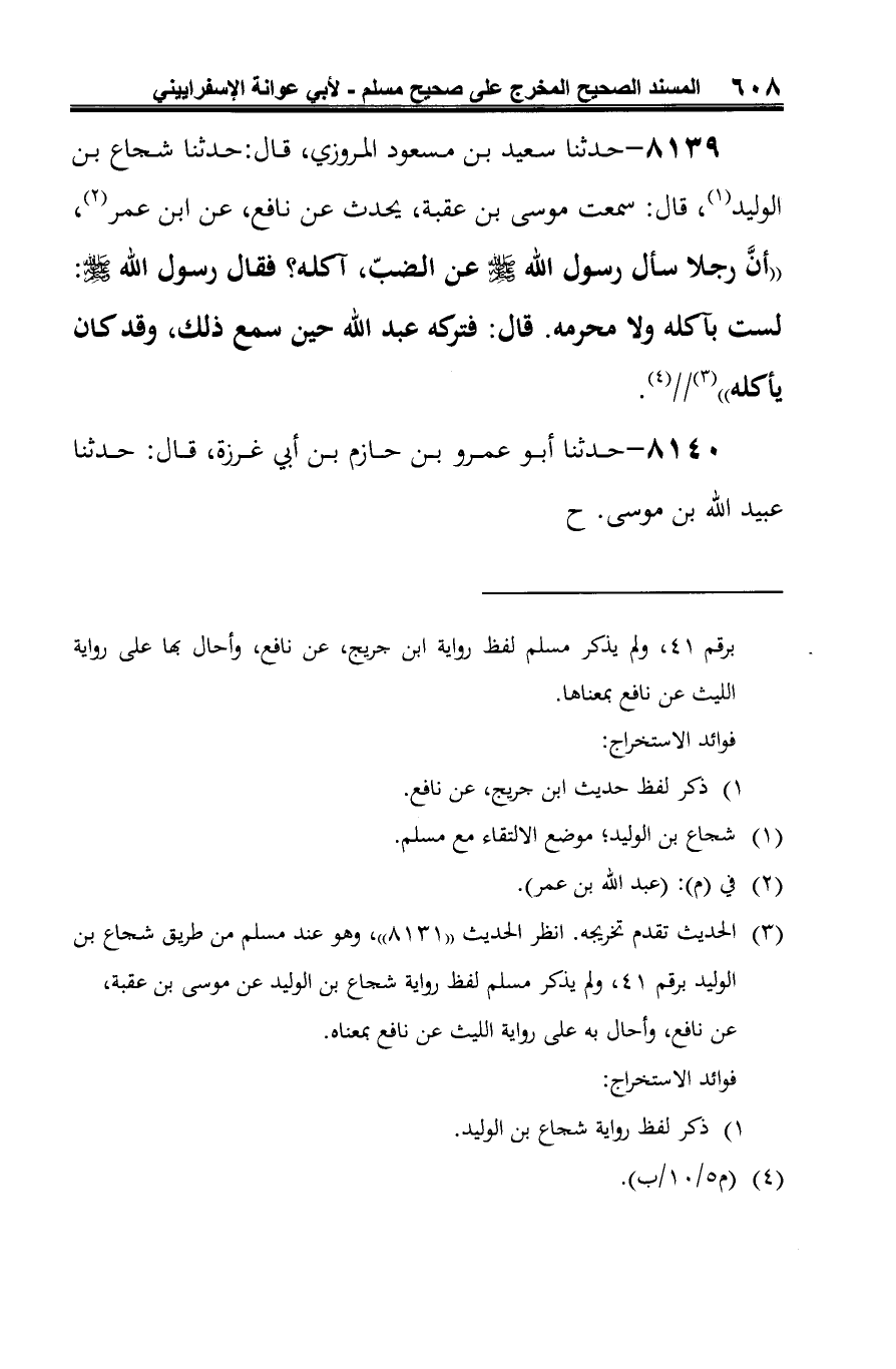 8139 - حدثنا سعيد بن مسعود المروزي، قال: حدثنا شجاع بن الوليد (¬1)، قال: سمعت موسى بن عقبة، يحدث عن نافع، عن ابن عمر (¬2)، "أنَّ رجلا سأل رسول الله صلى الله عليه وسلم عن الضبّ، آكله؟ فقال رسول الله صلى الله عليه وسلم: لست بآكله ولا محرمه. قال: فتركه عبد الله حين سمع ذلك، وقد كان يأكله" (¬3) (¬4).