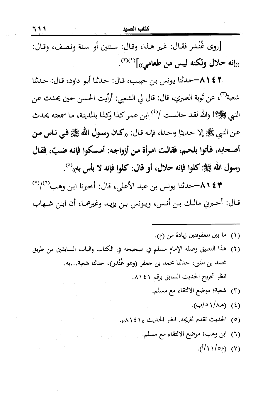 (¬7) أي أن يونس بن يزيد زاد في روايته عن ابن شهاب، ذكر حُفيدة بنت الحارث التي قدمت بالضب من نجد. يوضح هذا لفظ مسلم الذي أخرجه في صحيحه: من طريق يونس عن ابن شهاب عن أبي أمامة بن سهل بن حُنيف الأنصاري؛ "أن عبد الله بن عباس أخبره أن خالد بن الوليد الذي يقال له سيف الله المسلول أخبره، أنه دخل مع رسول الله -صلى الله عليه وسلم- على ميمونة -زوج النبي صلى الله عليه وسلم، وهي خالته وخالة ابن عباس- فوجد عندها ضبًّا محنوذا، قدمت به أختها حُفيدة بنت الحارث من نجد، فقدمت الضب لرسول الله -صلى الله عليه وسلم- ... ".