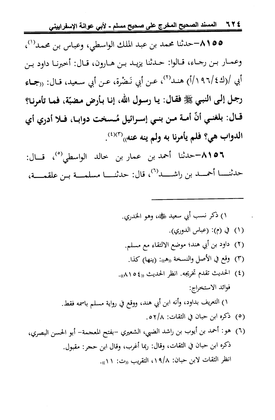 8155 - حدثنا محمد بن عبد الملك الواسطي، وعباس بن محمد (¬1)، وعمار بن رجاء، قالوا: حدثنا يزيد بن هارون، قال: أخبرنا داود بن أبي هند (¬2)، عن أبي نَضْرة، عن أبي سعيد، قال: "جاء رجل إلى النبي صلى الله عليه وسلم فقال: يا رسول الله، إنا بأرض مضبّة، فما تأمرنا؟ قال: بلغني أنّ أمة من بني إسرائيل مُسخت دوابا، فلا أدري أي الدواب هي؟ فلم يأمرنا به ولم ينه عنه" (¬3) (¬4).
