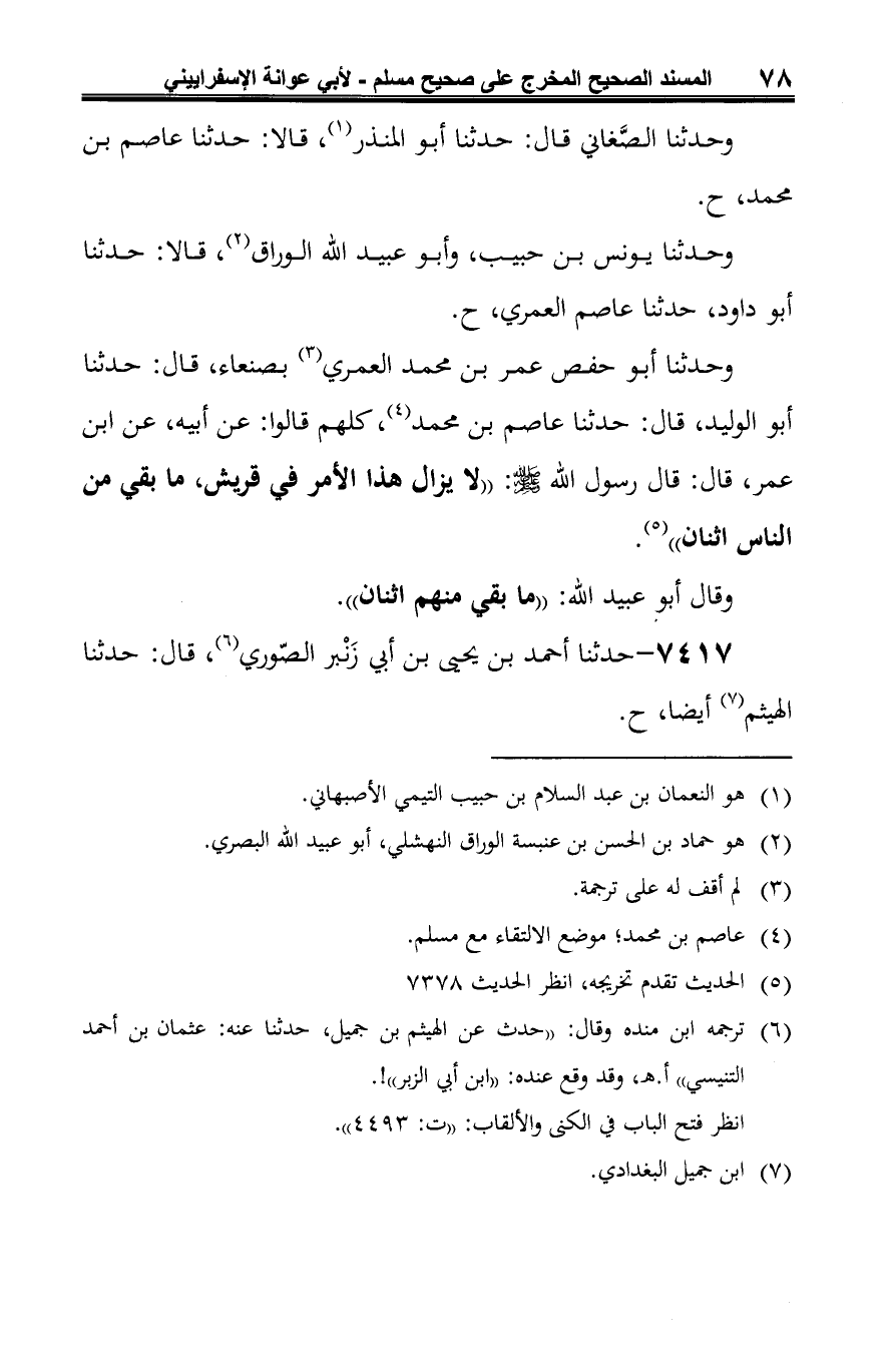 -[79]- وحدثنا أبو أمية، قال: حدثنا أحمد بن يونس (¬3)، قالا: حدثنا عاصم بن محمد، عن أبيه، عن ابن عمر، قال: سمعت النبي -صلى الله عليه وسلم- يقول: "لا يزال هذا الأمر في قريش ما بقي من الناس اثنان"، زاد أحمد بن يونس وغيره: "ويقول بإصبعيه هكذا" (¬4).