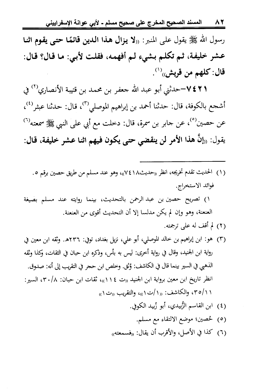 7421 - حدثني أبو عبد الله جعفر بن محمد بن قتيبة الأنصاري (¬1) في أشجع بالكوفة، قال: حدثنا أحمد بن إبراهيم الموصلي (¬2)، قال: حدثنا عبثر (¬3)، عن حصين (¬4)، عن جابر بن سمرة، قال: دخلت مع أبي على النبي -صلى الله عليه وسلم- سمعته (¬5) يقول: "إنَّ هذا الأمر لن ينقضي حتى يكون فيهم اثنا عشر خليفة، قال: