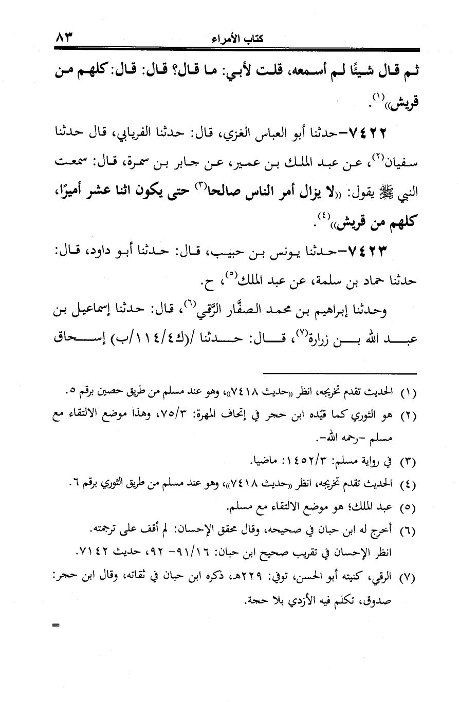 7422 - حدثنا أبو العباس الغزي، قال: حدثنا الفريابي، قال حدثنا لسفيان (¬1)، عن عبد الملك بن عمير، عن جابر بن سمرة، قال: سمعت النبي -صلى الله عليه وسلم- يقول: "لا يزال أمر الناس صالحا (¬2) حتى يكون اثنا عشر أميرًا، كلهم من قريش" (¬3).