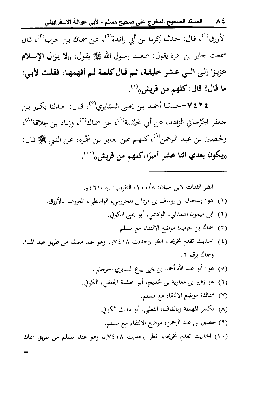 7424 - حدثنا أحمد بن يحيى السّابري (¬1)، قال: حدثنا بكير بن جعفر الجُرْجاني الزاهد، عن أبي خَيْثمة (¬2)، عن سماك (¬3)، وزياد بن عِلاقة (¬4)، وحُصين بن عبد الرحمن (¬5)، كلهم عن جابر بن سمُرة، عن النبي -صلى الله عليه وسلم- قال: "يكون بعدي اثنا عشر أميرًا، كلهم من قريش" (¬6).