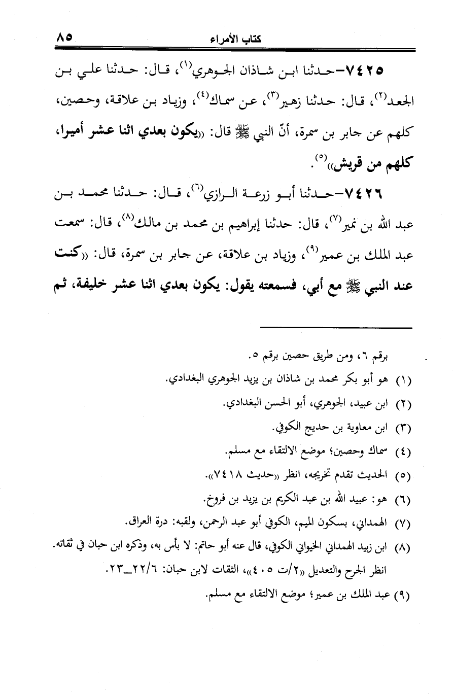 7425 - حدثنا ابن شاذان الجوهري (¬1)، قال: حدثنا علي بن الجعد (¬2)، قال: حدثنا زهير (¬3)، عن سماك (¬4)، وزياد بن علاقة، وحصين، كلهم عن جابر بن سمرة، أنّ النبي -صلى الله عليه وسلم- قال: "يكون بعدي اثنا عشر أميرا، كلهم من قريش" (¬5).