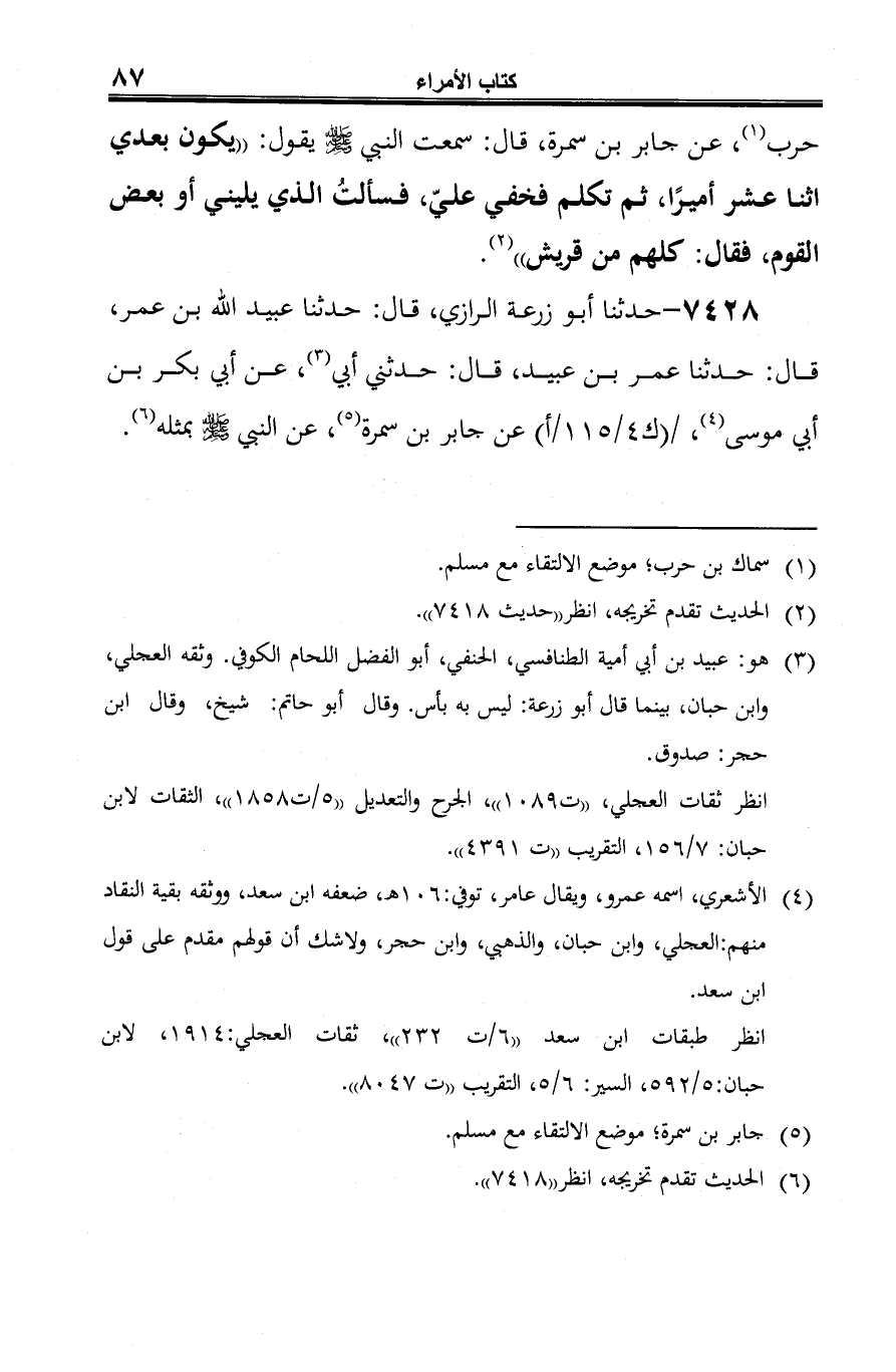 7428 - حدثنا أبو زرعة الرازي، قال: حدثنا عبيد الله بن عمر، قال: حدثنا عمر بن عبيد، قال: حدثني أبي (¬1)، عن أبي بكر بن أبي موسى (¬2)، عن جابر بن سمرة (¬3)، عن النبي -صلى الله عليه وسلم- بمثله (¬4).