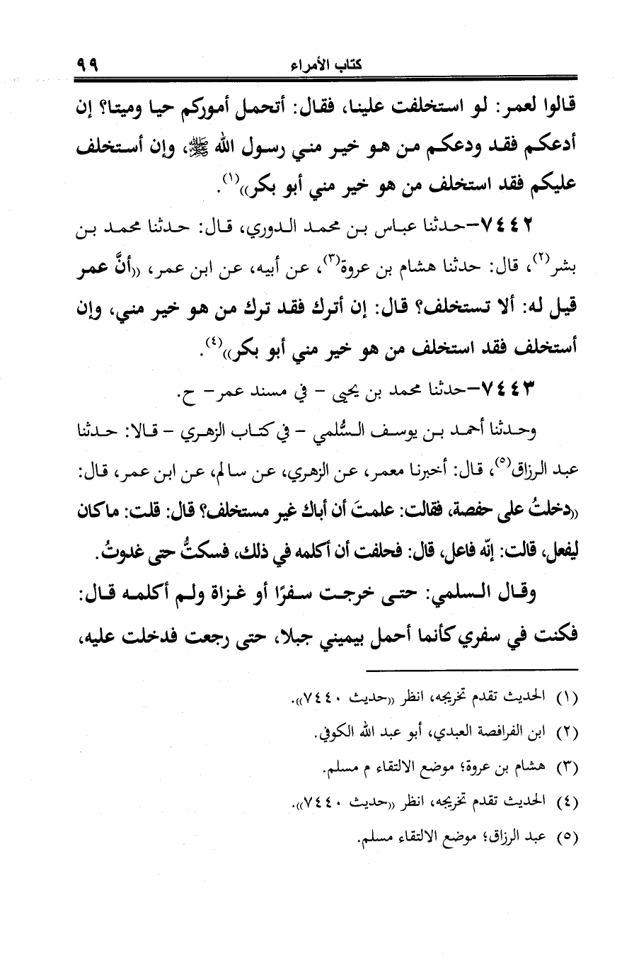 7442 - حدثنا عباس بن محمد الدوري، قال: حدثنا محمد بن بشر (¬1)، قال: حدثنا هشام بن عروة (¬2)، عن أبيه، عن ابن عمر، "أنَّ عمر قيل له: ألا تستخلف؟ قال: إن أترك فقد ترك من هو خير مني، كان أستخلف فقد استخلف من هو خير مني أبو بكر" (¬3).