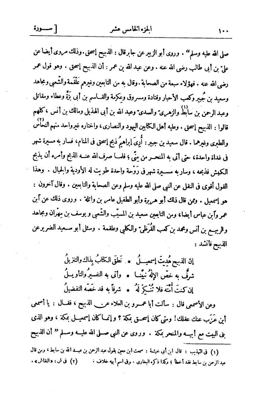 صَلَّى اللَّهُ عَلَيْهِمْ وَسَلَّمَ". وَرَوَى أَبُو الزُّبَيْرِ عن جابر قال: الذبيح إسحاق. وذلك مر وي أَيْضًا عَنْ عَلِيِّ بْنِ أَبِي طَالِبٍ رَضِيَ اللَّهُ عَنْهُ. وَعَنْ عَبْدِ اللَّهِ بْنِ عُمَرَ: أَنَّ الذَّبِيحَ إِسْحَاقُ. وَهُوَ قَوْلُ عُمَرَ رَضِيَ اللَّهُ عَنْهُ. فَهَؤُلَاءِ سَبْعَةٌ مِنَ الصَّحَابَةِ. وَقَالَ بِهِ مِنَ التَّابِعِينَ وَغَيْرِهِمْ عَلْقَمَةُ وَالشَّعْبِيُّ وَمُجَاهِدٌ وَسَعِيدُ بْنُ جُبَيْرٍ وَكَعْبُ الْأَحْبَارِ وَقَتَادَةُ وَمَسْرُوقٌ وَعِكْرِمَةُ وَالْقَاسِمُ بْنُ أَبِي بَزَّةَ وَعَطَاءٌ وَمُقَاتِلٌ وَعَبْدُ الرَّحْمَنِ بْنُ سَابِطٍ «١» وَالزُّهْرِيُّ وَالسُّدِّيُّ وَعَبْدُ اللَّهِ بْنُ أَبِي الْهُذَيْلِ وَمَالِكُ بْنُ أَنَسٍ، كُلُّهُمْ قَالُوا: الذَّبِيحُ إِسْحَاقُ. وَعَلَيْهِ أَهْلُ الْكِتَابَيْنِ الْيَهُودُ وَالنَّصَارَى، وَاخْتَارَهُ غَيْرُ وَاحِدٍ مِنْهُمُ النَّحَّاسُ «٢» وَالطَّبَرِيُّ وَغَيْرُهُمَا. قَالَ سَعِيدُ بْنُ جُبَيْرٍ: أُرِيَ إِبْرَاهِيمُ ذَبْحَ إِسْحَاقَ فِي الْمَنَامِ، فَسَارَ بِهِ مَسِيرَةَ شَهْرٍ فِي غَدَاةٍ وَاحِدَةٍ، حَتَّى أَتَى بِهِ الْمَنْحَرَ مِنْ مِنًى، فَلَمَّا صَرَفَ اللَّهُ عَنْهُ الذَّبْحَ وَأَمَرَهُ أَنْ يَذْبَحَ الْكَبْشَ فَذَبَحَهُ، وَسَارَ بِهِ مَسِيرَةَ شَهْرٍ فِي رَوْحَةٍ وَاحِدَةٍ طُوِيَتْ لَهُ الْأَوْدِيَةُ وَالْجِبَالُ. وَهَذَا الْقَوْلُ أَقْوَى فِي النَّقْلِ عَنِ النَّبِيِّ صَلَّى اللَّهُ عَلَيْهِ وَسَلَّمَ وَعَنْ الصَّحَابَةِ وَالتَّابِعِينَ. وَقَالَ آخَرُونَ: هُوَ إِسْمَاعِيلُ. وَمِمَّنْ قَالَ ذَلِكَ أَبُو هُرَيْرَةَ وَأَبُو الطُّفَيْلِ عَامِرُ بْنُ وَاثِلَةَ. وَرُوِيَ ذَلِكَ عَنِ ابْنِ عُمَرَ وَابْنِ عَبَّاسٍ أَيْضًا، وَمِنَ التَّابِعِينَ سَعِيدُ بْنُ الْمُسَيِّبِ وَالشَّعْبِيُّ وَيُوسُفُ بْنُ مِهْرَانَ وَمُجَاهِدٌ وَالرَّبِيعُ بْنُ أَنَسٍ وَمُحَمَّدُ بْنُ كَعْبٍ القرظي والكلبي وعلقمة. وسيل أَبُو سَعِيدٍ الضَّرِيرُ عَنِ الذَّبِيحِ فَأَنْشَدَ: