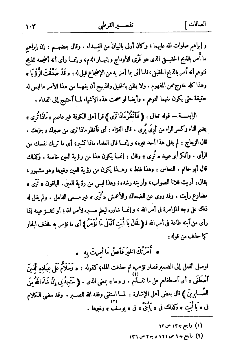 وَإِبْرَاهِيمَ صَلَوَاتُ اللَّهِ عَلَيْهِمَا، وَكَانَ أَوْلَى بِاْلَبَيانِ مِنَ الْفِدَاءِ. وَقَالَ بَعْضُهُمْ: إِنَّ إِبْرَاهِيمَ مَا أُمِرَ بِالذَّبْحِ الْحَقِيقِيِّ الَّذِي هُوَ فَرْيُ الْأَوْدَاجِ وَإِنْهَارُ الدَّمِ، وَإِنَّمَا رَأَى أَنَّهُ أَضْجَعَهُ لِلذَّبْحِ فَتَوَهَّمَ أَنَّهُ أُمِرَ بِالذَّبْحِ الْحَقِيقِيِّ، فَلَمَّا أَتَى بِمَا أُمِرَ بِهِ مِنَ الْإِضْجَاعِ قِيلَ لَهُ:" قَدْ صَدَّقْتَ الرُّؤْيا" وَهَذَا كُلُّهُ خَارِجٌ عَنِ الْمَفْهُومِ. وَلَا يُظَنُّ بِالْخَلِيلِ وَالذَّبِيحِ أَنْ يَفْهَمَا مِنْ هَذَا الْأَمْرِ مَا لَيْسَ لَهُ حَقِيقَةٌ حَتَّى يَكُونَ مِنْهُمَا التَّوَهُّمُ. وَأَيْضًا لَوْ صَحَّتْ هَذِهِ الْأَشْيَاءُ لَمَا احْتِيجَ إِلَى الْفِدَاءِ. الرَّابِعَةُ- قَوْلُهُ تَعَالَى:" فَانْظُرْ مَاذَا تَرى " قَرَأَ أَهْلُ الْكُوفَةِ غَيْرَ عَاصِمٍ" مَاذَا تُرِي" بِضَمِّ التَّاءِ وَكَسْرِ الرَّاءِ مِنْ أُرِيَ يُرِي. قَالَ الْفَرَّاءُ: أَيْ فَانْظُرْ مَاذَا تُرِي مِنْ صَبْرِكَ وَجَزَعِكَ. قَالَ الزَّجَّاجُ: لَمْ يَقُلْ هَذَا أَحَدٌ غَيْرَهُ، وَإِنَّمَا قَالَ الْعُلَمَاءُ مَاذَا تُشِيرُ، أَيْ مَا تُرِيَكَ نَفْسُكَ مِنَ الرَّأْيِ. وَأَنْكَرَ أَبُو عُبَيْدٍ" تُرِي" وَقَالَ: إِنَّمَا يَكُونَ هَذَا مِنْ رُؤْيَةِ الْعَيْنِ خَاصَّةً. وَكَذَلِكَ قَالَ أَبُو حَاتِمٍ. النَّحَّاسُ: وَهَذَا غَلَطٌ، وَهَذَا يَكُونُ مِنْ رُؤْيَةِ الْعَيْنِ وَغَيْرِهَا وَهُوَ مَشْهُورٌ، يُقَالُ: أَرَيْتُ فُلَانًا الصَّوَابَ، وَأَرَيْتُهُ رُشْدَهُ، وَهَذَا لَيْسَ مِنْ رُؤْيَةِ الْعَيْنِ. الْبَاقُونَ" تَرَى" مُضَارِعُ رَأَيْتَ. وَقَدْ رُوِيَ عَنِ الضَّحَّاكِ وَالْأَعْمَشِ" تُرَى" غَيْرُ مُسَمَّى الْفَاعِلِ. وَلَمْ يَقُلْ لَهُ ذَلِكَ عَلَى وَجْهِ الْمُؤَامَرَةِ فِي أَمْرِ اللَّهِ، وَإِنَّمَا شَاوَرَهُ لِيَعْلَمَ صَبْرَهُ لِأَمْرِ اللَّهِ، أَوْ لِتَقَرَّ عَيْنُهُ إِذَا رَأَى مِنَ ابْنِهِ طَاعَةً فِي أَمْرِ اللَّهِ. فَ" قالَ يَا أَبَتِ افْعَلْ مَا تُؤْمَرُ" أَيْ مَا تُؤْمَرُ بِهِ فَحُذِفَ الْجَارُّ كَمَا حُذِفَ مِنْ قَوْلِهِ: