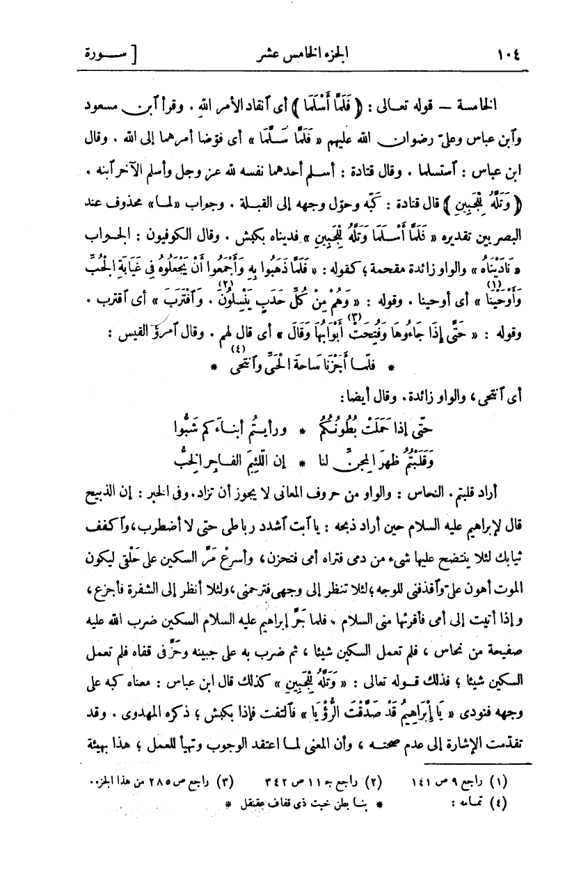 أَرَادَ قَلَبْتُمْ. النَّحَّاسُ: وَالْوَاوُ مِنْ حُرُوفِ الْمَعَانِي لَا يَجُوزُ أَنْ تُزَادَ. وَفِي الْخَبَرِ: إِنَّ الذَّبِيحَ قَالَ لِإِبْرَاهِيمَ عَلَيْهِ السَّلَامُ حِينَ أَرَادَ ذَبْحَهُ: يَا أَبَتِ اشْدُدْ رِبَاطِي حَتَّى لَا أَضْطَرِبَ، وَاكْفُفْ ثِيَابَكَ لِئَلَّا ينتضح عليها شي مِنْ دَمِي فَتَرَاهُ أُمِّي فَتَحْزَنَ، وَأَسْرِعْ مَرَّ السِّكِّينِ عَلَى حَلْقِي لِيَكُونَ الْمَوْتُ أَهْوَنَ عَلَيَّ وَاقْذِفْنِي لِلْوَجْهِ، لِئَلَّا تَنْظُرَ إِلَى وَجْهِي فَتَرْحَمَنِي، وَلِئَلَّا أَنْظُرَ إِلَى الشَّفْرَةِ فَأَجْزَعَ، وَإِذَا أَتَيْتَ إِلَى أُمِّي فَأَقْرِئْهَا مِنِّي السَّلَامَ. فَلَمَّا جَرَّ إِبْرَاهِيمُ عَلَيْهِ السَّلَامُ السِّكِّينَ ضَرَبَ اللَّهُ عَلَيْهِ صَفِيحَةً مِنْ نُحَاسٍ، فَلَمْ تَعْمَلِ السِّكِّينُ شَيْئًا، ثُمَّ ضَرَبَ بِهِ عَلَى جَبِينِهِ وَحَزَّ فِي قفاه فلم تعمل السكين شيئا، فذلك قو له تَعَالَى:" وَتَلَّهُ لِلْجَبِينِ" كَذَلِكَ قَالَ ابْنُ عَبَّاسٍ: مَعْنَاهُ كَبَّهُ عَلَى وَجْهِهِ فَنُودِيَ" يَا إِبْراهِيمُ قَدْ صَدَّقْتَ الرُّؤْيا" فَالْتَفَتَ فَإِذَا بِكَبْشٍ، ذَكَرَهُ الْمَهْدَوِيُّ. وَقَدْ تَقَدَّمَتِ الْإِشَارَةُ إِلَى عَدَمِ صِحَّتِهِ، وَأَنَّ الْمَعْنَى لَمَّا اعْتَقَدَ الْوُجُوبَ وَتَهَيَّأَ لِلْعَمَلِ، هذا بهيئة