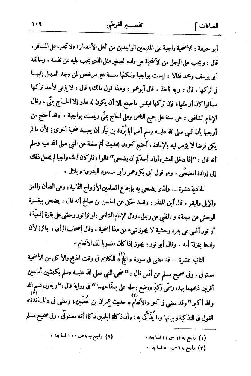 أَبُو حَنِيفَةَ: الْأُضْحِيَّةُ وَاجِبَةٌ عَلَى الْمُقِيمِينَ الْوَاجِدِينَ مِنْ أَهْلِ الْأَمْصَارِ، وَلَا تَجِبُ عَلَى الْمُسَافِرِ. قَالَ: وَيَجِبُ عَلَى الرَّجُلِ مِنَ الْأُضْحِيَّةِ عَلَى وَلَدِهِ الصَّغِيرِ مِثْلَ الَّذِي يَجِبُ عَلَيْهِ مِنْ نَفْسِهِ. وَخَالَفَهُ أَبُو يُوسُفَ وَمُحَمَّدٌ فَقَالَا: لَيْسَتْ بِوَاجِبَةٍ وَلَكِنَّهَا سُنَّةٌ غَيْرُ مُرَخَّصٍ لِمَنْ وَجَدَ السَّبِيلَ إِلَيْهَا فِي تَرْكِهَا. قَالَ: وَبِهِ نَأْخُذُ. قَالَ أَبُو عُمَرَ: وَهَذَا قَوْلُ مَالِكٍ، قَالَ: لَا يَنْبَغِي لِأَحَدٍ تَرْكُهَا مُسَافِرًا كَانَ أَوْ مُقِيمًا، فَإِنْ تَرَكَهَا فَبِئْسَ مَا صَنَعَ إِلَّا أَنْ يَكُونَ لَهُ عُذْرٌ إِلَّا الْحَاجَّ بِمِنًى. وَقَالَ الْإِمَامُ الشَّافِعِيُّ: هِيَ سُنَّةٌ عَلَى جَمِيعِ النَّاسِ وَعَلَى الْحَاجِّ بِمِنًى وَلَيْسَتْ بِوَاجِبَةٍ. وَقَدِ احْتَجَّ مَنْ أَوْجَبَهَا بِأَنَّ النَّبِيَّ صَلَّى اللَّهُ عَلَيْهِ وَسَلَّمَ أَمَرَ أَبَا بُرْدَةَ بْنَ نِيَارٍ أَنْ يُعِيدَ ضَحِيَّةً أُخْرَى، لِأَنَّ مَا لَمْ يَكُنْ فَرْضًا لَا يُؤْمَرُ فِيهِ بِالْإِعَادَةِ. احْتَجَّ آخَرُونَ بِحَدِيثِ أُمِّ سَلَمَةَ عَنِ النَّبِيِّ صَلَّى اللَّهُ عَلَيْهِ وَسَلَّمَ أَنَّهُ قَالَ:" إِذَا دَخَلَ الْعَشْرُ وَأَرَادَ أَحَدُكُمْ أَنْ يُضَحِّيَ قَالُوا: فَلَوْ كَانَ ذَلِكَ وَاجِبًا لَمْ يَجْعَلْ ذَلِكَ إِلَى إِرَادَةِ الْمُضَحِّي" وَهُوَ قَوْلُ أَبِي بَكْرٍ وَعُمَرَ وأبي مسعود البدري وبلال. الحادية- وَالَّذِي يُضَحَّى بِهِ بِإِجْمَاعِ الْمُسْلِمِينَ الْأَزْوَاجُ الثَّمَانِيَةُ: وَهِيَ الضَّأْنُ وَالْمَعْزُ وَالْإِبِلُ وَالْبَقَرُ. قَالَ ابْنُ الْمُنْذِرِ: وَقَدْ حُكِيَ عَنِ الْحَسَنِ بْنِ صَالِحٍ أَنَّهُ قَالَ: يُضَحَّى بِبَقَرَةِ الْوَحْشِ عَنْ سَبْعَةٍ، وَبِالظَّبْيِ عَنْ رَجُلٍ. وَقَالَ الْإِمَامُ الشَّافِعِيُّ: لَوْ نَزَا ثَوْرٌ وَحْشِيٌّ عَلَى بَقَرَةٍ إِنْسِيَّةٍ، أَوْ ثَوْرٌ إِنْسِيٌّ عَلَى بَقَرَةٍ وَحْشِيَّةٍ لَا يَجُوزُ شي مِنْ هَذَا أُضْحِيَّةً. وَقَالَ أَصْحَابُ الرَّأْيِ: جَائِزٌ، لِأَنَّ وَلَدَهَا بِمَنْزِلَةِ أُمِّهِ. وَقَالَ أَبُو ثَوْرٍ: يجوز إذا كا ن منسوبا إلى الأنعام. الثانية عشرة- وقد مَضَى فِي سُورَةِ" الْحَجِّ" «١» الْكَلَامُ فِي وَقْتِ الذَّبْحِ وَالْأَكْلِ مِنَ الْأُضْحِيَّةِ مُسْتَوْفًى. وَفِي صَحِيحِ مُسْلِمٍ عَنْ أَنَسٍ قَالَ:" ضَحَّى النَّبِيُّ صَلَّى اللَّهُ عَلَيْهِ وَسَلَّمَ بِكَبْشَيْنِ أَمْلَحَيْنِ أَقْرَنَيْنِ ذَبَحَهُمَا بِيَدِهِ وَسَمَّى وَكَبَّرَ وَوَضَعَ رِجْلَهُ عَلَى صِفَاحِهِمَا" فِي رِوَايَةٍ قَالَ" وَيَقُولُ بِسْمِ اللَّهِ وَاللَّهُ أَكْبَرُ" وَقَدْ مَضَى فِي آخِرِ" الْأَنْعَامِ" «٢» حَدِيثُ عِمْرَانَ بْنِ حُصَيْنٍ، وَمَضَى فِي" الْمَائِدَةِ" «٣» الْقَوْلُ فِي التَّذْكِيَةِ وَبَيَانُهَا وَمَا يُذَكَّى بِهِ، وَأَنَّ ذَكَاةَ الْجَنِينِ ذَكَاةُ أُمِّهِ مُسْتَوْفًى. وَفِي صَحِيحِ مسلم