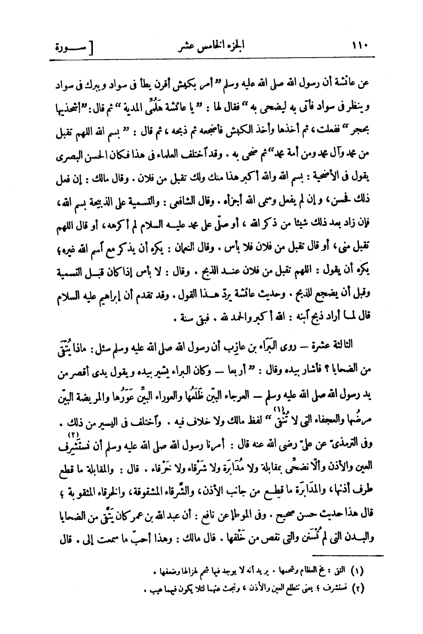 عَنْ عَائِشَةَ أَنَّ رَسُولَ اللَّهِ صَلَّى اللَّهُ عَلَيْهِ وَسَلَّمَ" أَمَرَ بِكَبْشٍ أَقْرَنَ يَطَأُ فِي سَوَادٍ وَيَبْرُكُ فِي سَوَادٍ وَيَنْظُرُ فِي سَوَادٍ فَأُتِيَ بِهِ لِيُضَحِّيَ بِهِ" فَقَالَ لَهَا:" يَا عَائِشَةُ هَلُمِّي الْمُدْيَةَ" ثُمَّ قَالَ:" اشْحَذِيهَا بِحَجَرٍ" فَفَعَلَتْ، ثُمَّ أَخَذَهَا وَأَخَذَ الْكَبْشَ فَأَضْجَعَهُ ثُمَّ ذَبَحَهُ، ثُمَّ قَالَ:" بِسْمِ اللَّهِ اللَّهُمَّ تَقَبَّلْ مِنْ مُحَمَّدٍ وَآلِ مُحَمَّدٍ وَمِنْ أُمَّةِ مُحَمَّدٍ" ثُمَّ ضَحَّى بِهِ. وَقَدِ اخْتَلَفَ الْعُلَمَاءُ فِي هَذَا فَكَانَ الْحَسَنُ الْبَصْرِيُّ يَقُولُ فِي الْأُضْحِيَّةِ: بِسْمِ اللَّهِ وَاللَّهُ أَكْبَرُ هَذَا مِنْكَ وَلَكَ تَقَبَّلْ مِنْ فُلَانٍ. وَقَالَ مَالِكٌ: إِنْ فَعَلَ ذَلِكَ فَحَسَنٌ، وَإِنْ لَمْ يَفْعَلْ وَسَمَّى اللَّهَ أَجْزَأَهُ. وَقَالَ الشَّافِعِيُّ: وَالتَّسْمِيَةُ عَلَى الذَّبِيحَةِ بِسْمِ اللَّهِ، فَإِنْ زَادَ بَعْدَ ذَلِكَ شَيْئًا مِنْ ذِكْرِ اللَّهِ، أَوْ صَلَّى عَلَى مُحَمَّدٍ عَلَيْهِ السَّلَامُ لَمْ أَكْرَهْهُ، أَوْ قَالَ اللَّهُمَّ تَقَبَّلْ مِنِّي، أَوْ قَالَ تَقَبَّلْ مِنْ فُلَانٍ فَلَا بأ س. وَقَالَ النُّعْمَانُ: يُكْرَهُ أَنْ يَذْكُرَ مَعَ اسْمِ اللَّهِ غَيْرُهُ، يُكْرَهُ أَنْ يَقُولَ: اللَّهُمَّ تَقَبَّلْ مِنْ فُلَانٍ عِنْدَ الذَّبْحِ. وَقَالَ: لَا بَأْسَ إِذَا كَانَ قَبْلَ التَّسْمِيَةِ وَقَبْلَ أَنْ يُضْجِعَ لِلذَّبْحِ. وَحَدِيثُ عَائِشَةَ يَرُدُّ هَذَا الْقَوْلَ. وَقَدْ تَقَدَّمَ أَنَّ إِبْرَاهِيمَ عَلَيْهِ السَّلَامُ قَالَ لَمَّا أَرَادَ ذَبْحَ ابْنِهِ: اللَّهُ أَكْبَرُ وَالْحَمْدُ لِلَّهِ. فَبَقِيَ سُنَّةً. الثَّالِثَةَ عَشْرَةَ- رَوَى الْبَرَاءُ بْنُ عَازِبٍ أَنَّ رَسُولَ اللَّهِ صَلَّى اللَّهُ عَلَيْهِ وَسَلَّمَ سُئِلَ: مَاذَا يُتَّقَى مِنَ الضَّحَايَا؟ فَأَشَارَ بِيَدِهِ وَقَالَ:" أَرْبَعًا- وَكَانَ الْبَرَاءُ يُشِيرُ بِيَدِهِ وَيَقُولُ يَدِي أَقْصَرُ مِنْ يَدِ رَسُولِ اللَّهِ صَلَّى اللَّهُ عَلَيْهِ وَسَلَّمَ- الْعَرْجَاءُ الْبَيِّنُ ظَلَعُهَا وَالْعَوْرَاءُ الْبَيِّنُ عَوَرُهَا وَالْمَرِيضَةُ الْبَيِّنُ مَرَضُهَا وَالْعَجْفَاءُ الَّتِي لَا تُنْقَى" «١» لَفْظُ مَالِكٍ وَلَا خِلَافَ فِيهِ. وَاخْتُلِفَ فِي الْيَسِيرِ مِنْ ذَلِكَ. وَفِي التِّرْمِذِيُّ عَنْ عَلِيٍّ رَضِيَ اللَّهُ عَنْهُ قَالَ: أَمَرَنَا رَسُولُ اللَّهِ صَلَّى اللَّهُ عَلَيْهِ وَسَلَّمَ أن نستشرف «٢» العين الإذن وَأَلَّا نُضَحِّيَ بِمُقَابَلَةٍ وَلَا مُدَابَرَةٍ وَلَا شَرْقَاءَ وَلَا خَرْقَاءَ. قَالَ: وَالْمُقَابَلَةُ مَا قُطِعَ طَرَفُ أُذُنِهَا، وَالْمُدَابَرَةُ مَا قُطِعَ مِنْ جَانِبِ الْأُذُنِ، وَالشَّرْقَاءُ الْمَشْقُوقَةُ، وَالْخَرْقَاءُ الْمَثْقُوبَةُ، قَالَ هَذَا حَدِيثٌ حَسَنٌ صَحِيحٌ. وَفِي الْمُوَطَّأِ عَنْ نَافِعٍ: أَنَّ عَبْدَ اللَّهِ بْنَ عُمَرَ كَانَ يَتَّقِي مِنَ الضَّحَايَا وَالْبُدْنِ الَّتِي لَمْ تُسْنَنْ وَالَّتِي نَقَصَ مِنْ خَلْقِهَا. قَالَ مَالِكٌ: وَهَذَا أَحَبُّ مَا سمعت إلي. قال