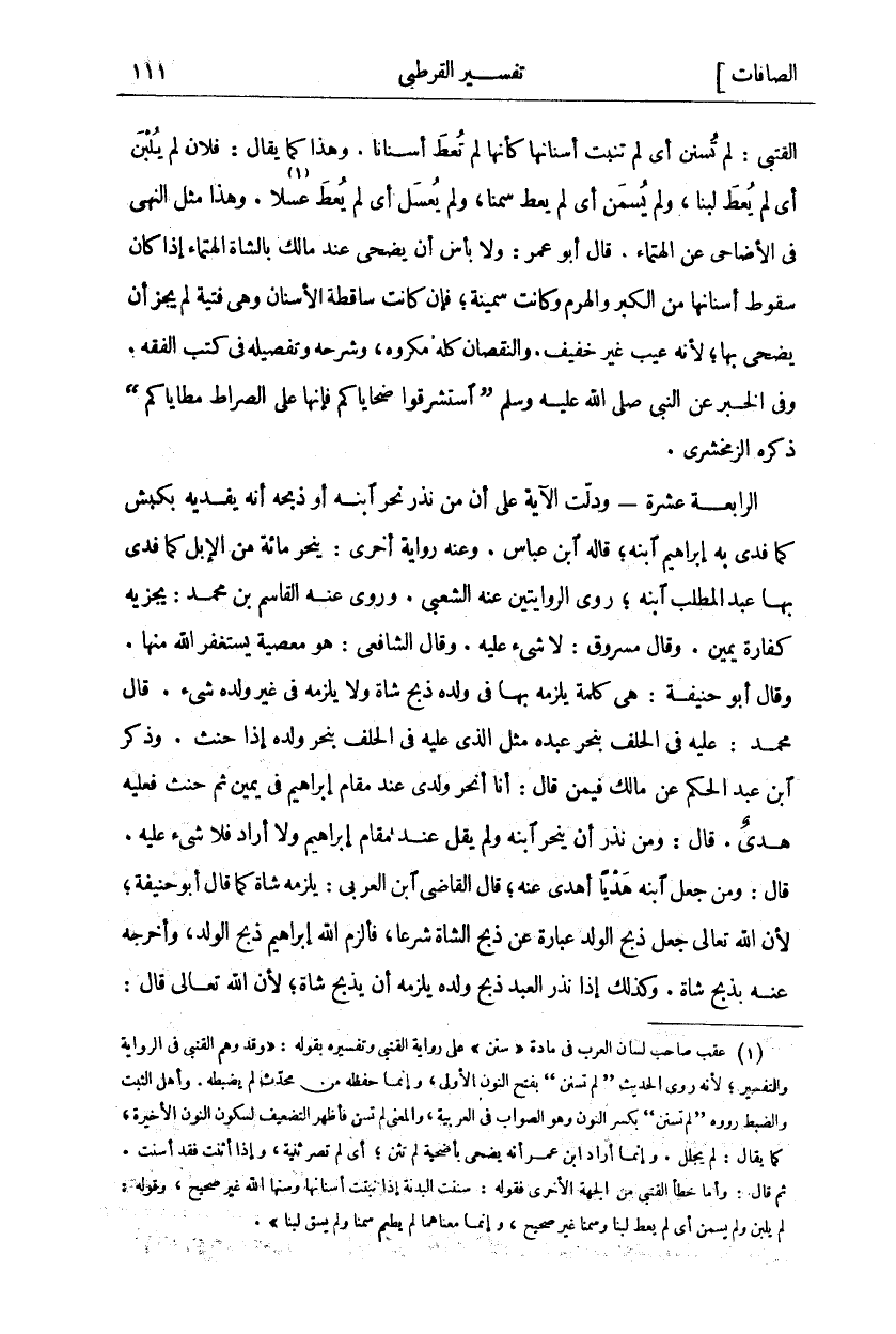 الْقُتَبِيُّ: لَمْ تُسْنَنْ أَيْ لَمْ تَنْبُتْ أَسْنَانُهَا كَأَنَّهَا لَمْ تُعْطَ أَسْنَانًا. وَهَذَا كَمَا يُقَالُ: فُلَانٌ لَمْ يُلْبَنْ أَيْ لَمْ يُعْطَ لَبَنًا، وَلَمْ يُسْمَنْ أَيْ لَمْ يُعْطَ سَمْنًا، وَلَمْ يُعْسَلْ أَيْ لَمْ يُعْطَ عَسَلًا «١». وَهَذَا مِثْلُ النَّهْيِ فِي الْأَضَاحِيِّ عَنِ الْهَتْمَاءِ. قَالَ أَبُو عُمَرَ: وَلَا بَأْسَ أَنْ يُضَحَّى عِنْدَ مَالِكٍ بِالشَّاةِ الْهَتْمَاءِ إِذَا كَانَ سُقُوطُ أَسْنَانِهَا مِنَ الْكِبَرِ وَالْهَرَمِ وَكَانَتْ سَمِينَةً، فَإِنْ كَانَتْ سَاقِطَةَ الْأَسْنَانِ وَهِيَ فَتِيَّةٌ لَمْ يَجُزْ أَنْ يُضَحَّى بِهَا، لِأَنَّهُ عَيْبٌ غَيْرُ خَفِيفٍ. وَالنُّقْصَانُ كُلُّهُ مَكْرُوهٌ، وَشَرْحُهُ وَتَفْصِيلُهُ فِي كُتُبِ الْفِقْهِ. وَفِي الْخَبَرَ عَنِ النَّبِيِّ صَلَّى اللَّهُ عَلَيْهِ وَسَلَّمَ:" اسْتَشْرِقُوا ضَحَايَاكُمْ فَإِنَّهَا عَلَى الصِّرَاطِ مَطَايَاكُمْ" ذَكَرَهُ الزمخشري. الرابعة عشر- وَدَلَّتِ الْآيَةُ عَلَى أَنَّ مَنْ نَذَرَ نَحْرَ ابنه أو ذ بحة أَنَّهُ يَفْدِيهِ بِكَبْشٍ كَمَا فَدَى بِهِ إِبْرَاهِيمُ ابنه، قال ابْنُ عَبَّاسٍ. وَعَنْهُ رِوَايَةٌ أُخْرَى: يَنْحَرُ مِائَةً مِنَ الْإِبِلِ كَمَا فَدَى بِهَا عَبْدُ الْمُطَّلِبِ ابْنَهُ، رَوَى الرِّوَايَتَيْنِ عَنْهُ الشَّعْبِيُّ. وَرَوَى عَنْهُ الْقَاسِمُ بْنُ مُحَمَّدٍ: يَجْزِيهِ كَفَّارَةُ يَمِينٍ. وَقَالَ مسروق: لا شي عليه. وقال الشا فعي: هُوَ مَعْصِيَةٌ يَسْتَغْفِرُ اللَّهَ مِنْهَا. وَقَالَ أَبُو حَنِيفَةَ: هِيَ كَلِمَةٌ يَلْزَمُهُ بِهَا فِي وَلَدِهِ ذَبْحُ شَاةٍ وَلَا يَلْزَمُهُ فِي غَيْرِ وَلَدِهِ شي. قَالَ مُحَمَّدٌ: عَلَيْهِ فِي الْحَلِفِ بِنَحْرِ عَبْدِهِ مِثْلُ الَّذِي عَلَيْهِ فِي الْحَلِفِ بِنَحْرِ وَلَدِهِ إِذَا حَنِثَ. وَذَكَرَ ابْنُ عَبْدِ الْحَكَمِ عَنْ مَالِكٍ فِيمَنْ قَالَ: أَنَا أَنْحَرُ وَلَدِي عِنْدَ مَقَامِ إِبْرَاهِيمَ فِي يَمِينٍ ثُمَّ حَنِثَ فَعَلَيْهِ هَدْيٌ. قَالَ: وَمَنْ نَذَرَ أَنْ يَنْحَرَ ابْنَهُ وَلَمْ يَقُلْ عِنْدَ مَقَامِ إِبْرَاهِيمَ وَلَا أَرَادَ فلا شي عَلَيْهِ. قَالَ: وَمَنْ جَعَلَ ابْنَهُ هَدْيًا أَهْدَى عَنْهُ، قَالَ الْقَاضِي ابْنُ الْعَرَبِيِّ: يَلْزَمُهُ شَاةٌ كَمَا قَالَ أَبُو حَنِيفَةَ، لِأَنَّ اللَّهَ تَعَالَى جَعَلَ ذَبْحَ الْوَلَدِ عِبَارَةً عَنْ ذَبْحِ الشَّاةِ شَرْعًا، فَأَلْزَمَ اللَّهُ إِبْرَاهِيمَ ذَبْحَ الْوَلَدِ، وَأَخْرَجَهُ عَنْهُ بِذَبْحِ شَاةٍ. وَكَذَلِكَ إِذَا نَذَرَ الْعَبْدُ ذَبْحَ وَلَدِهِ يَلْزَمُهُ أَنْ يَذْبَحَ شَاةً، لِأَنَّ الله تعالى قال: