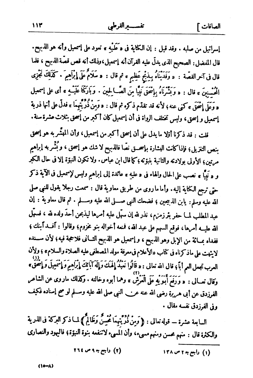 إِسْرَائِيلَ مِنْ صُلْبِهِ. وَقَدْ قِيلَ: إِنَّ الْكِنَايَةَ فِي" عَلَيْهِ" تَعُودُ عَلَى إِسْمَاعِيلَ وَأَنَّهُ هُوَ الذَّبِيحُ. قَالَ الْمُفَضَّلُ: الصَّحِيحُ الَّذِي يَدُلُّ عَلَيْهِ الْقُرْآنُ أَنَّهُ إِسْمَاعِيلُ وَذَلِكَ أَنَّهُ قَصَّ قِصَّةَ الذَّبِيحِ، فَلَمَّا قَالَ فِي آخِرِ الْقِصَّةِ:" وَفَدَيْناهُ بِذِبْحٍ عَظِيمٍ" ثُمَّ قَالَ:" سَلامٌ عَلى إِبْراهِيمَ. كَذلِكَ نَجْزِي الْمُحْسِنِينَ" قَالَ:" وَبَشَّرْناهُ بِإِسْحاقَ نَبِيًّا مِنَ الصَّالِحِينَ. وَبارَكْنا عَلَيْهِ" أَيْ عَلَى إِسْمَاعِيلَ" وَعَلَى إِسْحَاقَ" كَنَّى عَنْهُ، لِأَنَّهُ قَدْ تَقَدَّمَ ذِكْرُهُ. ثُمَّ قَالَ:" وَمِنْ ذُرِّيَّتِهِما" فَدَلَّ عَلَى أَنَّهَا ذُرِّيَّةُ إِسْمَاعِيلَ وَإِسْحَاقَ، وَلَيْسَ تَخْتَلِفُ الرُّوَاةُ فِي أَنَّ إِسْمَاعِيلَ كَانَ أَكْبَرَ مِنْ إِسْحَاقَ بِثَلَاثَ عَشْرَةَ سَنَةً. قُلْتُ: قَدْ ذَكَرْنَا أَوَّلًا مَا يَدُلُّ عَلَى أَنَّ إِسْحَاقَ أَكْبَرُ مِنْ إِسْمَاعِيلَ، وَأَنَّ الْمُبَشَّرَ بِهِ هُوَ إِسْحَاقُ بِنَصِّ التَّنْزِيلِ، فَإِذَا كَانَتِ الْبِشَارَةُ بِإِسْحَاقَ نَصًّا فَالذَّبِيحُ لَا شَكَ هُوَ إِسْحَاقُ، وَبُشِّرَ بِهِ إِبْرَاهِيمُ مَرَّتَيْنِ، الْأُولَى بِوِلَادَتِهِ وَالثَّانِيَةُ بِنُبُوَّتِهِ، كَمَا قَالَ ابْنُ عَبَّاسٍ. وَلَا تَكُونُ النُّبُوَّةُ إِلَّا فِي حَالِ الْكِبَرِ وَ" نَبِيًّا" نَصْبٌ عَلَى الْحَالِ وَالْهَاءُ فِي" عَلَيْهِ" عَائِدَةٌ إِلَى إِبْرَاهِيمَ وَلَيْسَ لِإِسْمَاعِيلَ فِي الْآيَةِ ذِكْرٌ حَتَّى تَرْجِعَ الْكِنَايَةُ إِلَيْهِ. وَأَمَّا مَا رُوِيَ مِنْ طَرِيقِ مُعَاوِيَةَ قَالَ: سَمِعْتُ رَجُلًا يَقُولُ لِلنَّبِيِّ صَلَّى اللَّهُ عَلَيْهِ وَسَلَّمَ: يا بن الذَّبِيحَيْنِ، فَضَحِكَ النَّبِيِّ صَلَّى اللَّهُ عَلَيْهِ وَسَلَّمَ. ثُمَّ قَالَ مُعَاوِيَةُ: إِنَّ عَبْدَ الْمُطَّلِبِ لَمَّا حَفَرَ بِئْرَ زَمْزَمَ، نَذَرَ لِلَّهِ إِنْ سَهَّلَ عَلَيْهِ أَمْرَهَا لَيَذْبَحَنَّ أَحَدَ وَلَدِهِ لِلَّهِ، فَسَهَّلَ اللَّهُ عَلَيْهِ أَمْرَهَا، فَوَقَعَ السَّهْمُ عَلَى عَبْدِ اللَّهِ، فَمَنَعَهُ أَخْوَالُهُ بَنُو مَخْزُومٍ، وَقَالُوا: افْدِ ابْنَكَ، فَفَدَاهُ بِمِائَةٍ مِنَ الْإِبِلِ وَهُوَ الذَّبِيحُ، وَإِسْمَاعِيلُ هُوَ الذَّبِيحُ الثَّانِي فَلَا حُجَّةَ فِيهِ، لِأَنَّ سَنَدَهُ لَا يَثْبُتُ عَلَى مَا ذَكَرْنَاهُ فِي كِتَابِ الْأَعْلَامِ فِي مَعْرِفَةِ مَوْلِدِ الْمُصْطَفَى عَلَيْهِ الصَّلَاةُ وَالسَّلَامُ، وَلِأَنَّ الْعَرَبَ تَجْعَلُ الْعَمَّ أَبًا، قَالَ اللَّهُ تَعَالَى:" قالُوا نَعْبُدُ إِلهَكَ وَإِلهَ آبائِكَ إِبْراهِيمَ وَإِسْماعِيلَ وَإِسْحاقَ" [البقرة: ١٣٣] وقال تعالى:" وَرَفَعَ أَبَوَيْهِ عَلَى الْعَرْشِ" [يوسف: ١٠٠] وَهُمَا أَبُوهُ وَخَالَتُهُ. وَكَذَلِكَ مَا رُوِيَ عَنِ الشَّاعِرِ الْفَرَزْدَقِ عَنْ أَبِي هُرَيْرَةَ رَضِيَ اللَّهُ عَنْهُ عَنِ النَّبِيِّ صَلَّى اللَّهُ عَلَيْهِ وَسَلَّمَ لَوْ صَحَّ إِسْنَادُهُ فَكَيْفَ وَفِي الْفَرَزْدَقِ نَفْسِهِ مَقَالٌ. السَّابِعَةَ عَشْرَةَ- قَوْلُهُ تَعَالَى:" وَمِنْ ذُرِّيَّتِهِما مُحْسِنٌ وَظالِمٌ" لَمَّا ذَكَرَ الْبَرَكَةَ فِي الذُّرِّيَّةِ وَالْكَثْرَةَ قَالَ: منهم محسن ومنهم مسي، وَإِنَّ الْمُسِيءَ لَا تَنْفَعُهُ بُنُوَّةِ النُّبُوَّةِ، فَالْيَهُودُ والنصارى